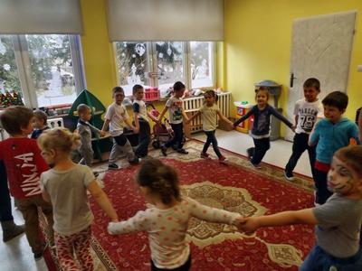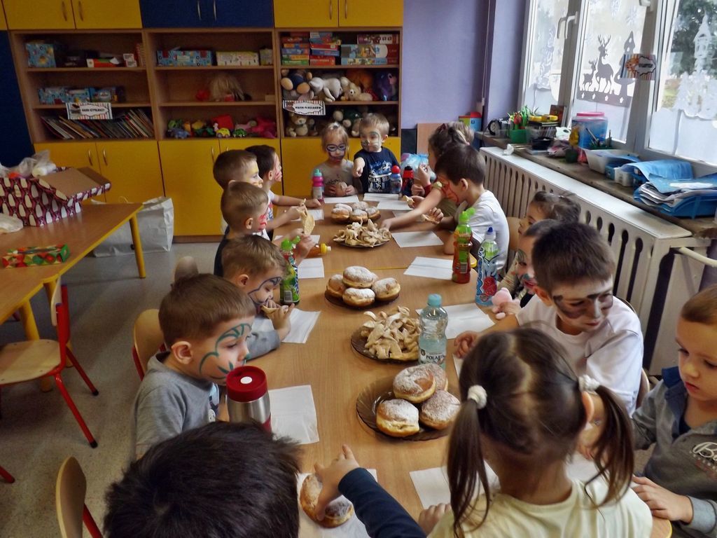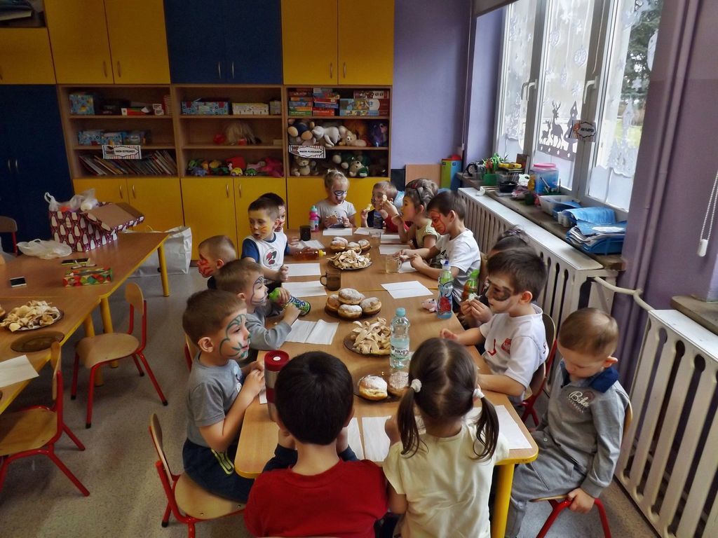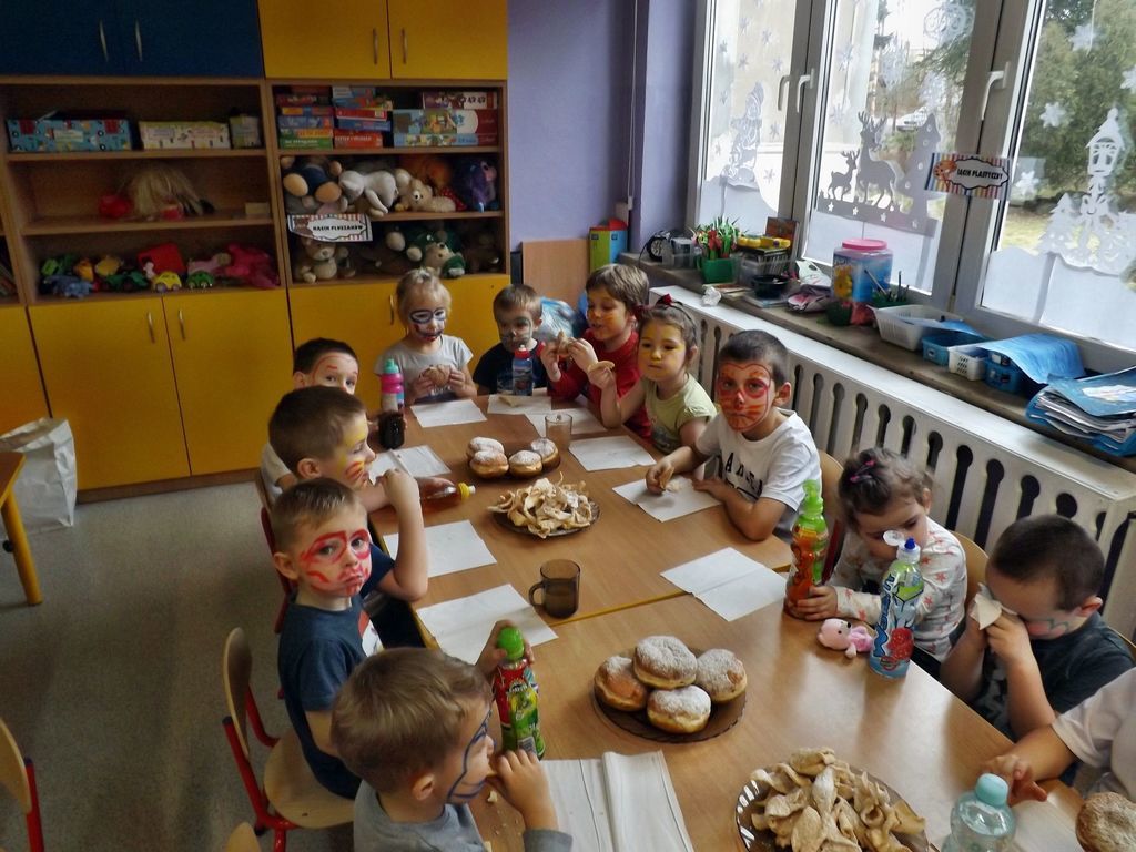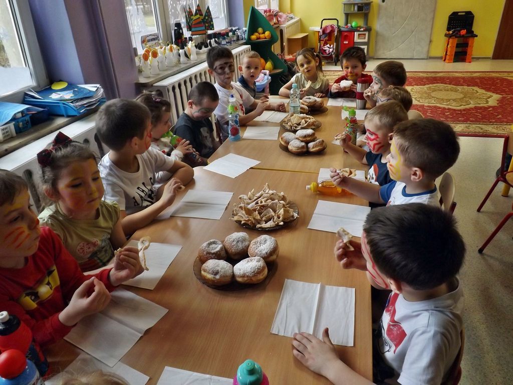 Przedszkolaki radośnie spędziły tłusty czwartek. Zostały zorganizowane dla nich wesołe zabawy, tańce przy ulubionej muzyce. Zgodnie z tradycją nie zabrakło smacznych pączków i faworków.