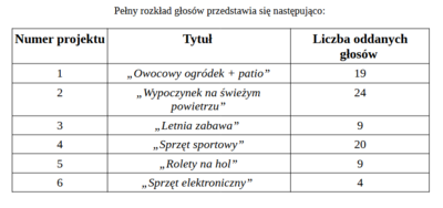 Głosowanie w ramach Szkolnego Budżetu Partycypacyjnego cieszyło się dużą frekwencją – zagłosowało 85 osób. Bardzo nas cieszy, że niemal cała społeczność szkolna oddała swój głos w ważnej dla wszystkich sprawie. Najwięcej głosów zdobył Projekt nr 2 „Wypoczynek...