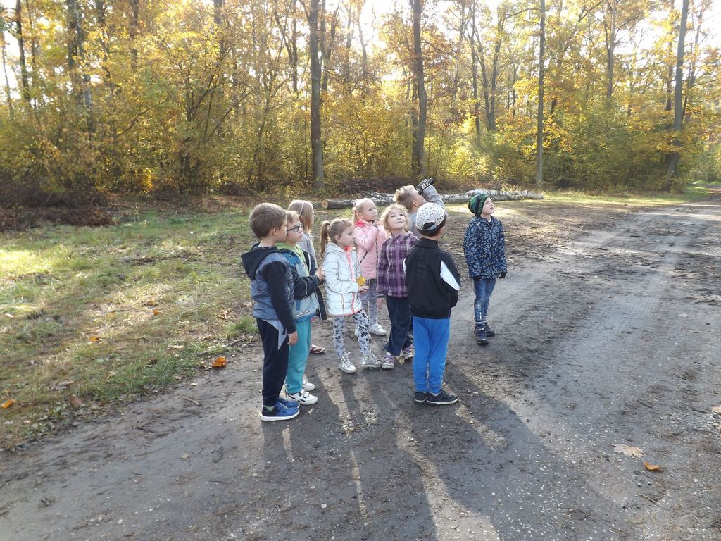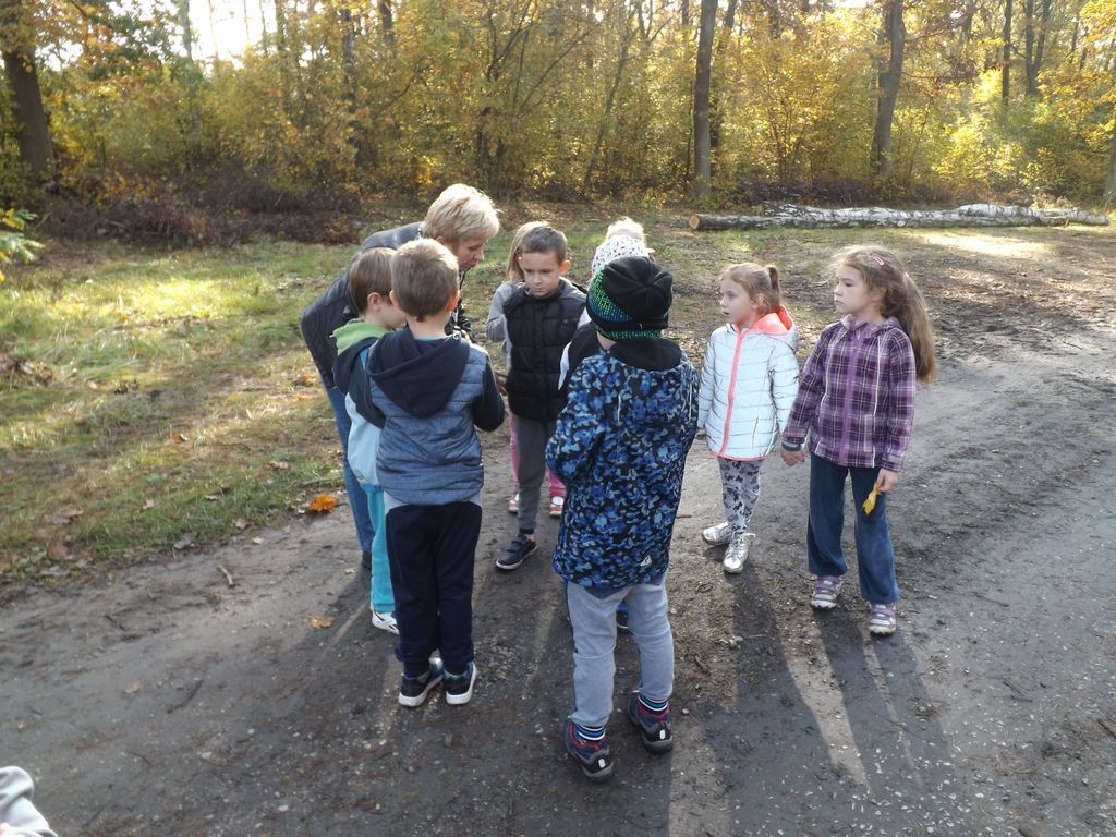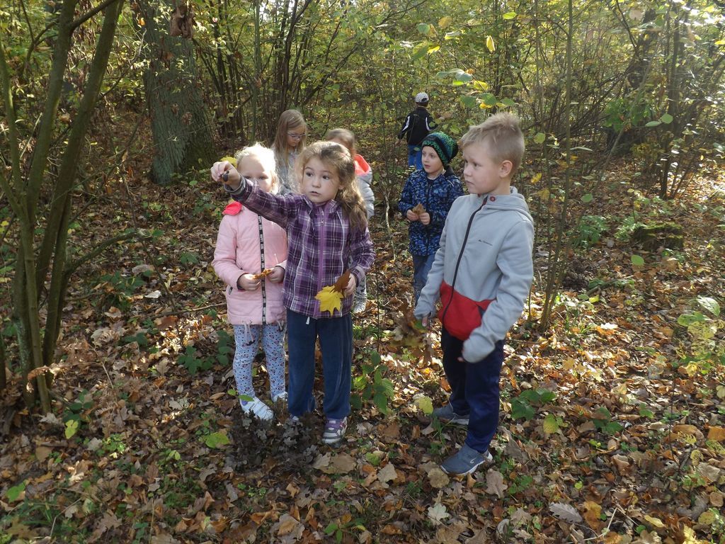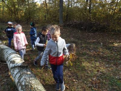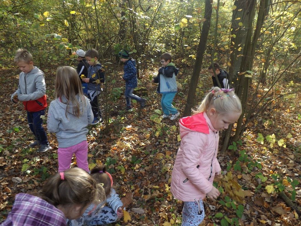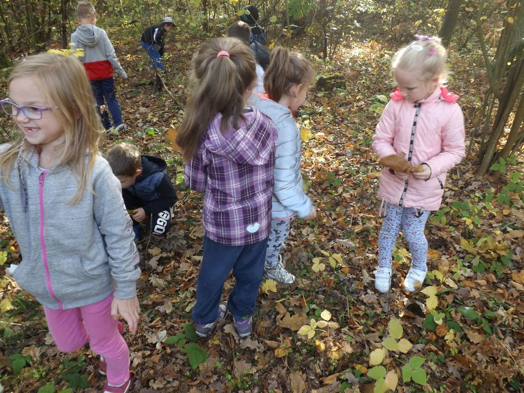 Dnia 17.10.2017 r. grupa „0” udała się na wycieczkę do lasu. Dzieci miały możliwość podziwiania piękna jesiennych barw, poznawania środowiska przyrodniczego jakim jest las. W bezpośrednim kontakcie z przyrodą rozpoznawały drzewa iglaste i liściaste. W dokładnym porównywaniu koron drzew i kształtu liści pomagała nam lornetka. Wycieczka udała się, wszyscy wrócili zadowoleni, a nasz kącik przyrodniczy wzbogacił się o dary przyniesione z lasu.