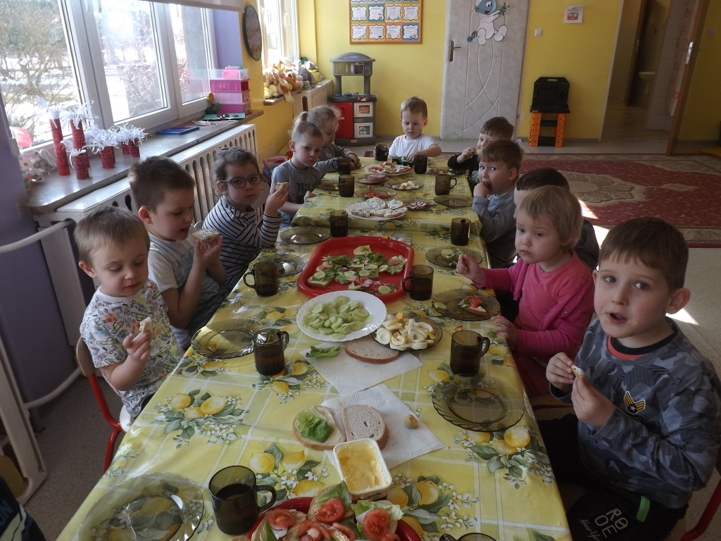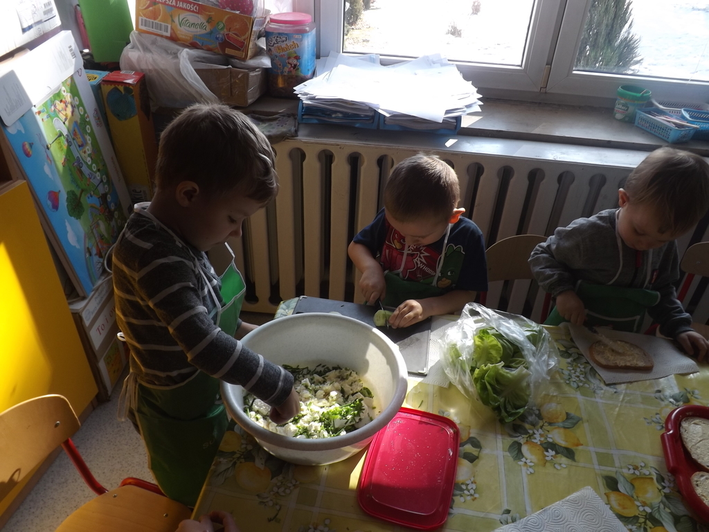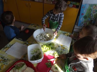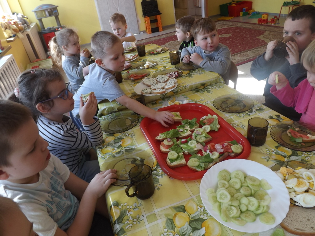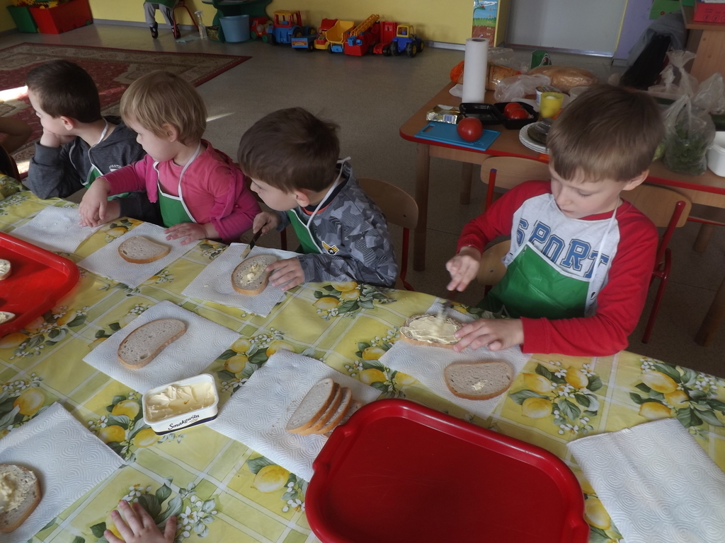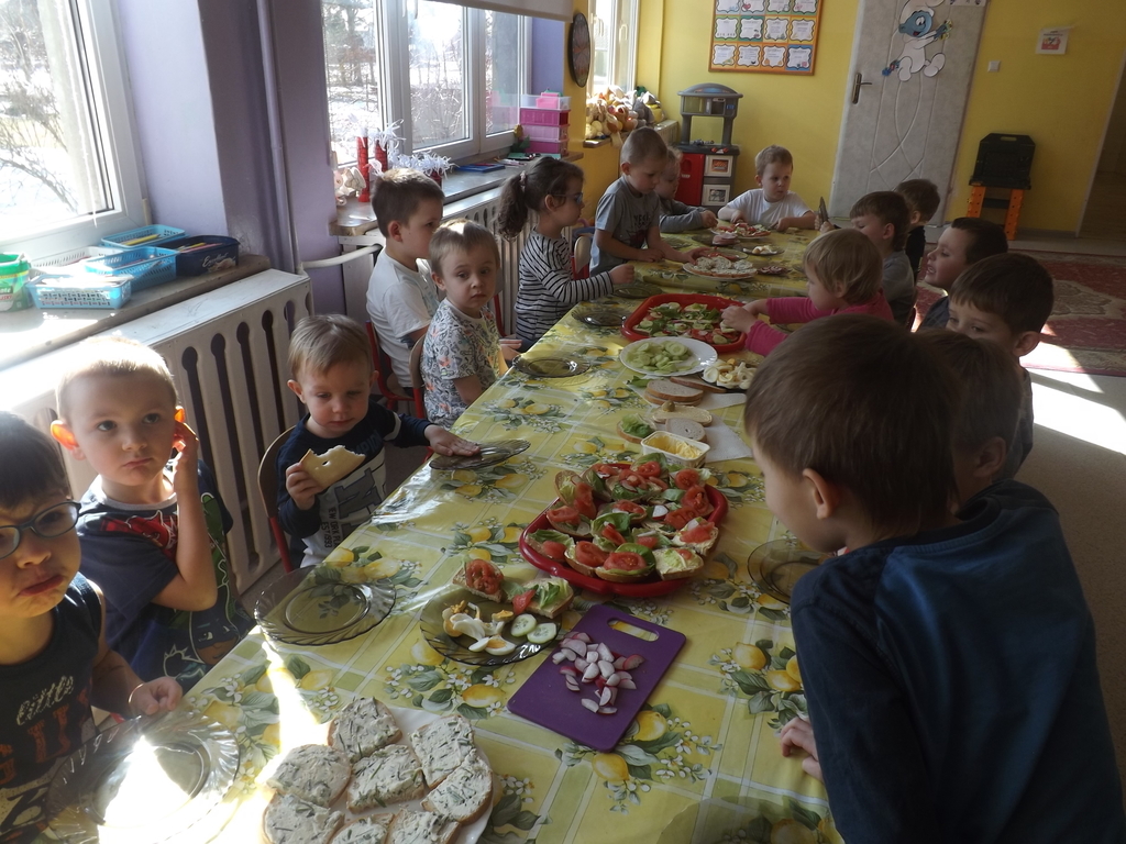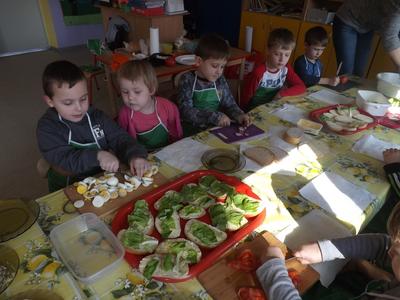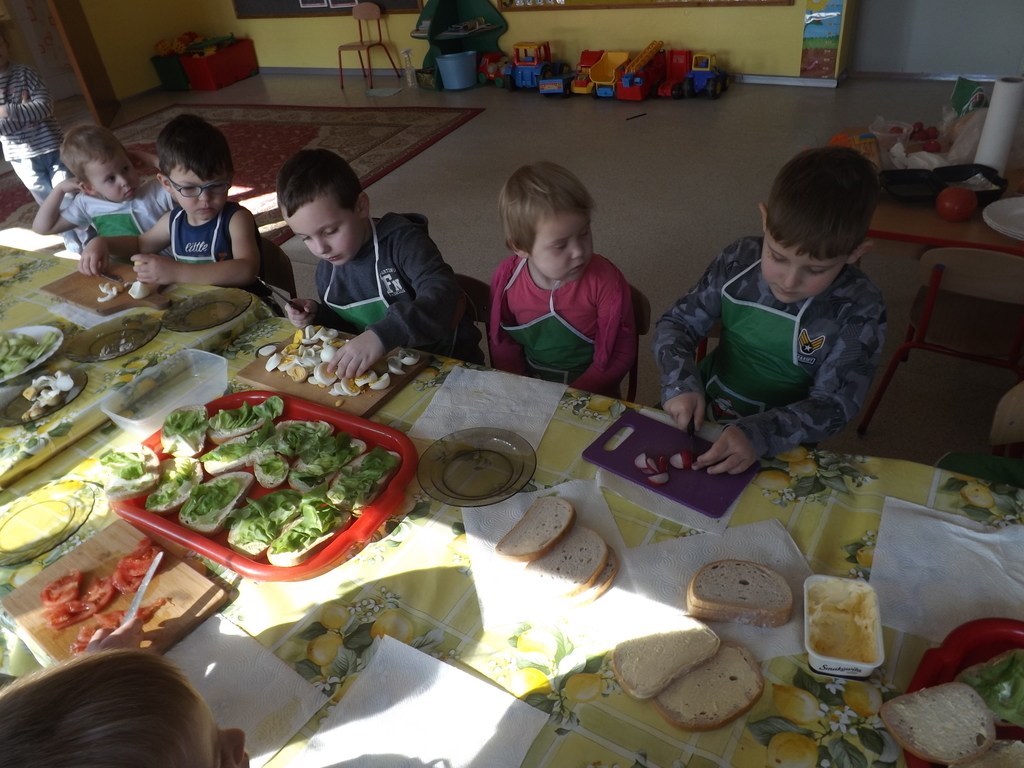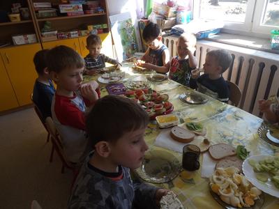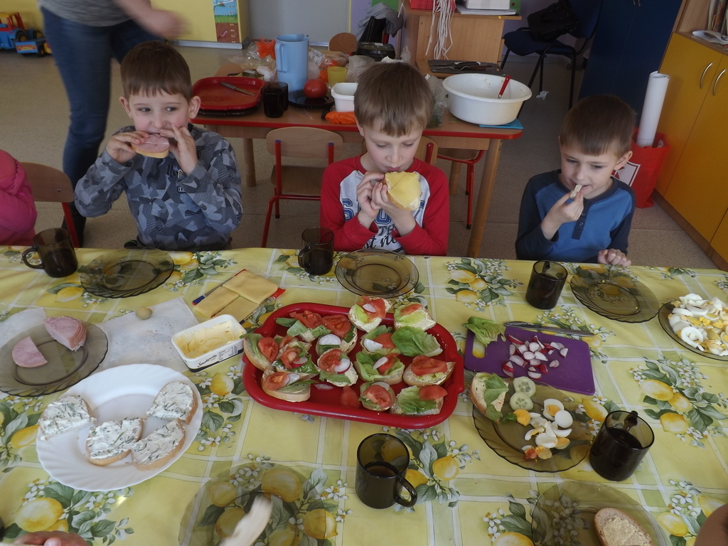 Na stołach zagościły nowalijki, wędliny, sery, jajka, pieczywo. Przedszkolaki korzystały z przyborów kuchennych. Dzieci samodzielnie lub z niewielką pomocą Pań smarowały, kroiły, układały produkty tworząc wiosenne kanapki. Każdy przedszkolak sam skomponował swoje kanapki według upodobań. Kolorowe, bogate w witaminy kanapki w mig znikały w talerzyków. Wszystkie dzieci, nawet największe „niejadki” zajadały wiosenne kanapki o ogromnym apetytem.