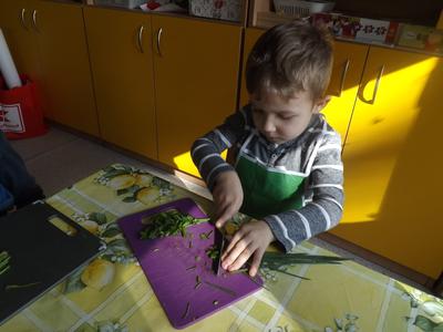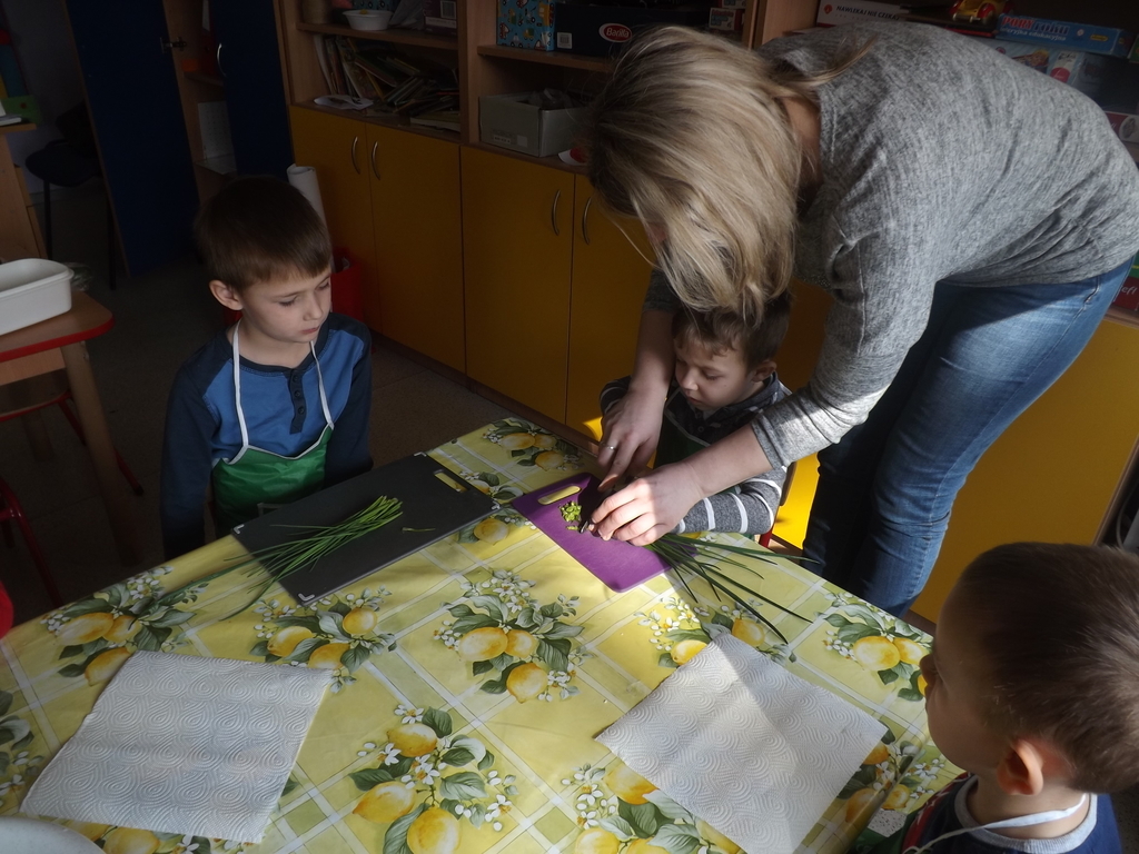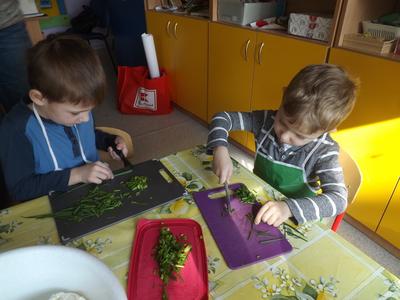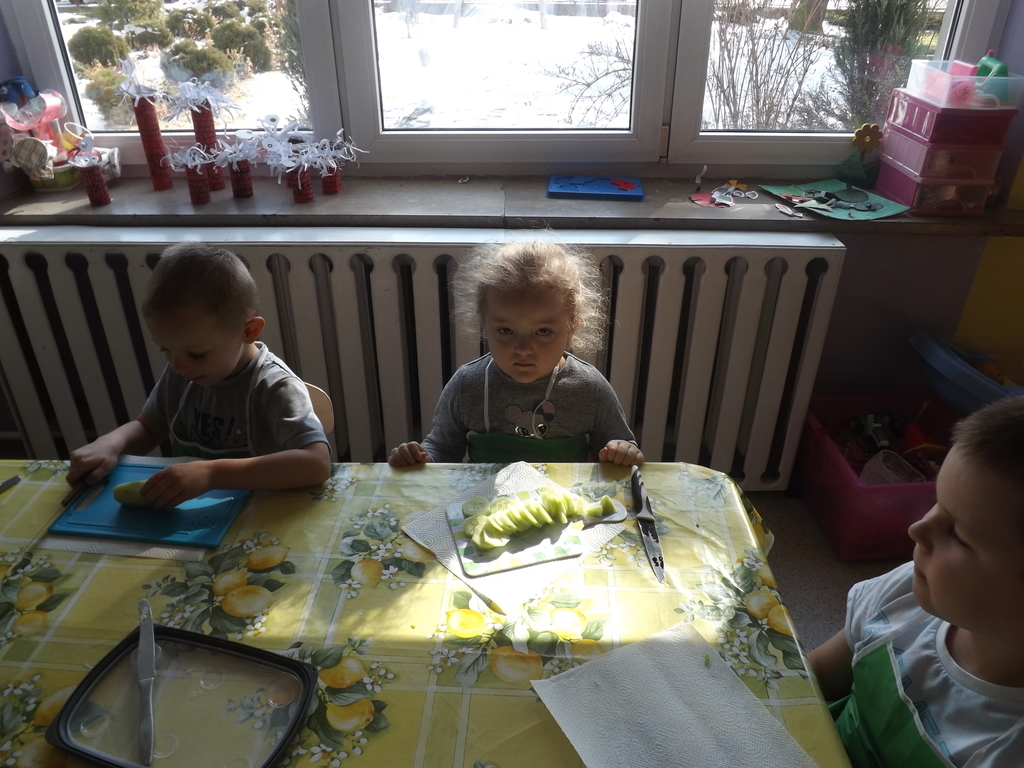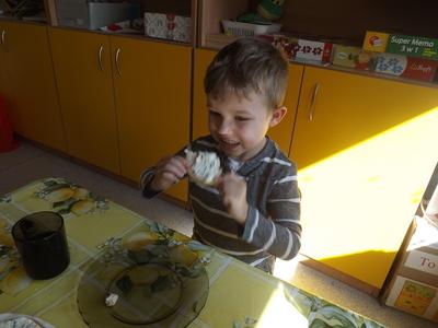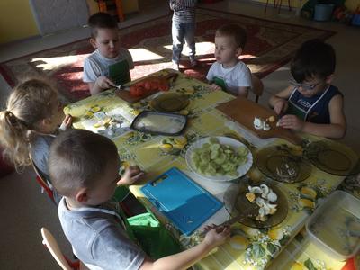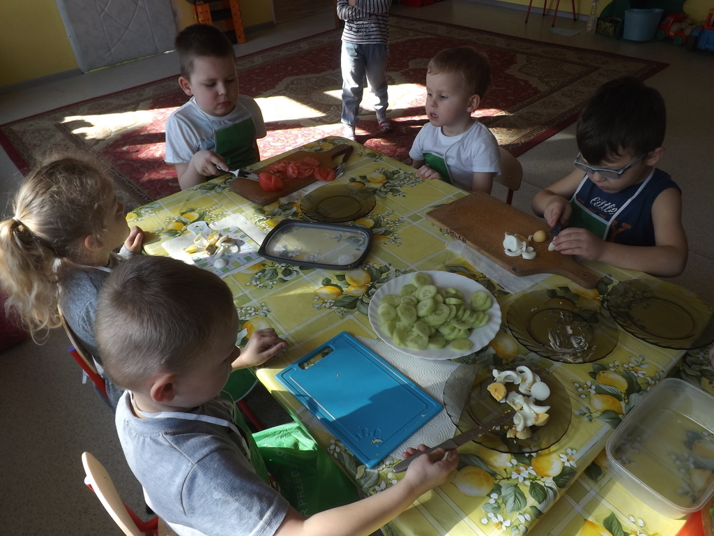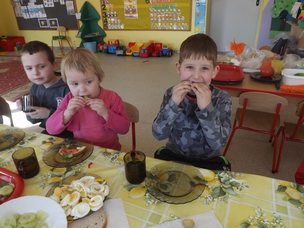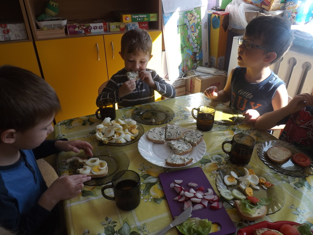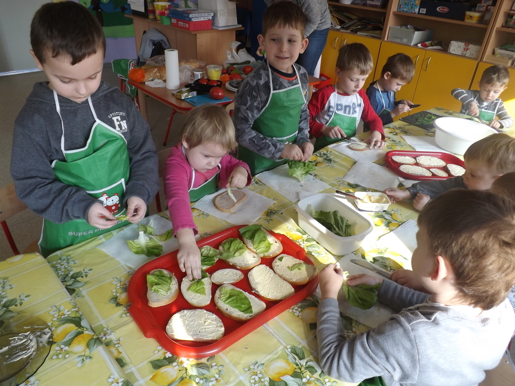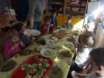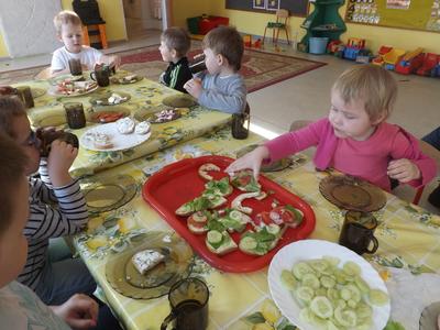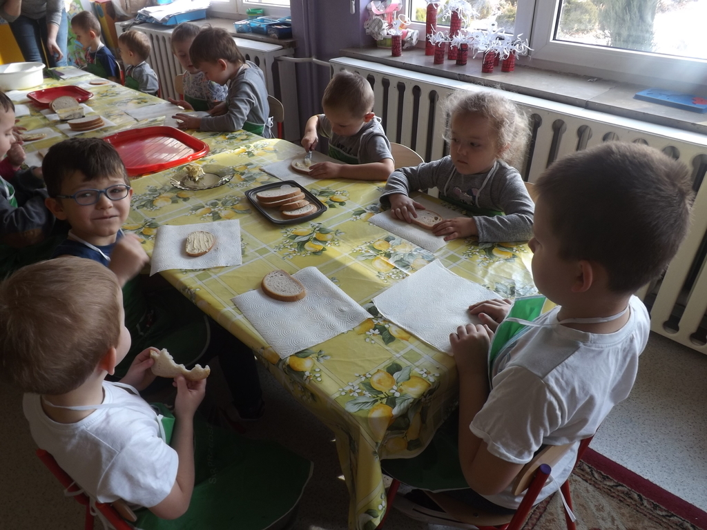 Na stołach zagościły nowalijki, wędliny, sery, jajka, pieczywo. Przedszkolaki korzystały z przyborów kuchennych. Dzieci samodzielnie lub z niewielką pomocą Pań smarowały, kroiły, układały produkty tworząc wiosenne kanapki. Każdy przedszkolak sam skomponował swoje kanapki według upodobań. Kolorowe, bogate w witaminy kanapki w mig znikały w talerzyków. Wszystkie dzieci, nawet największe „niejadki” zajadały wiosenne kanapki o ogromnym apetytem.