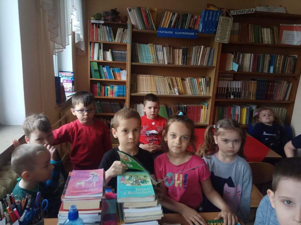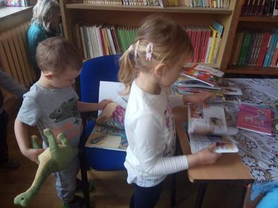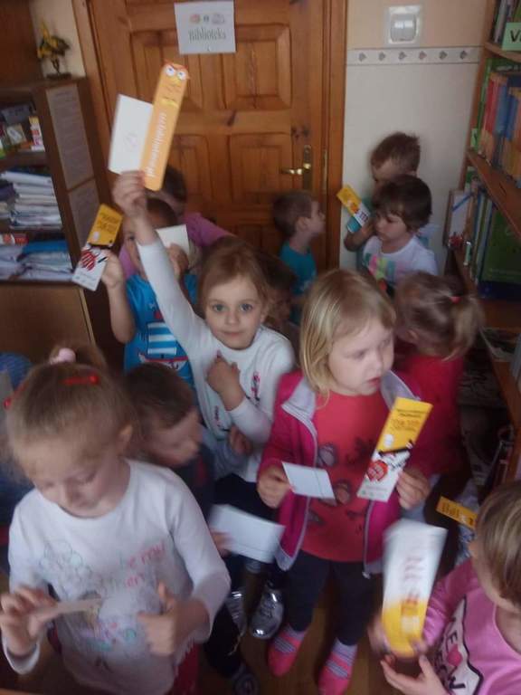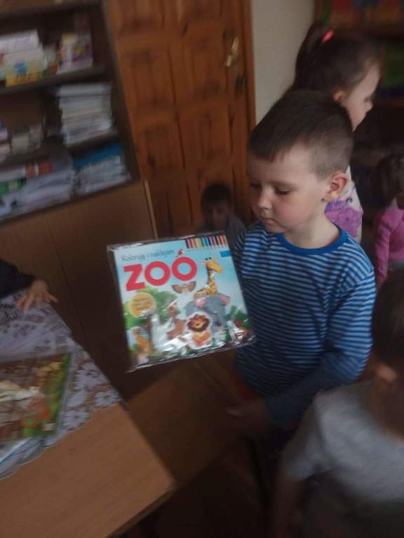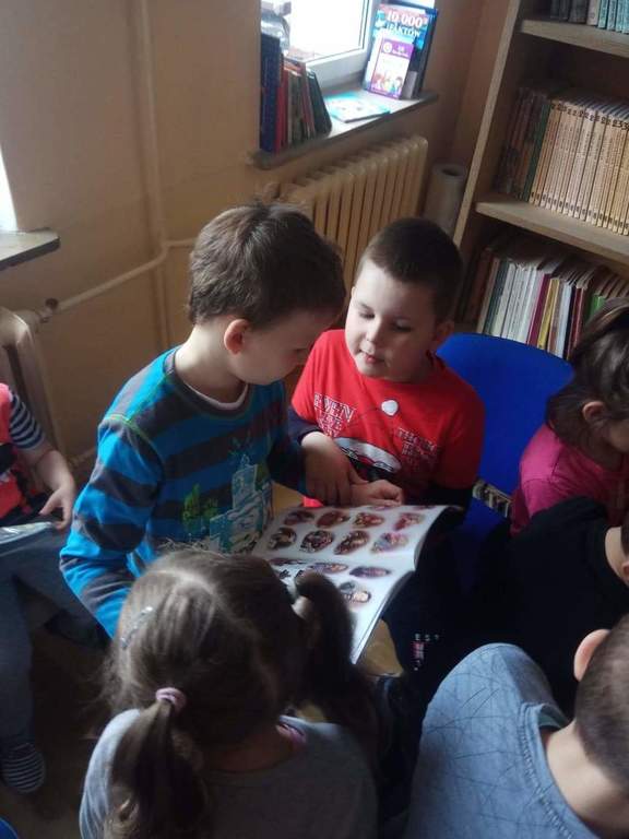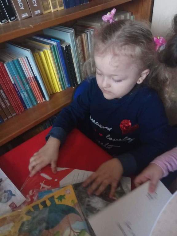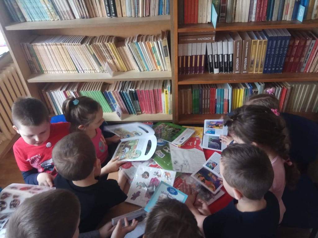 Dzieci z grup przedszkolnych wybrały się na wizytę do Biblioteki Szkolnej.