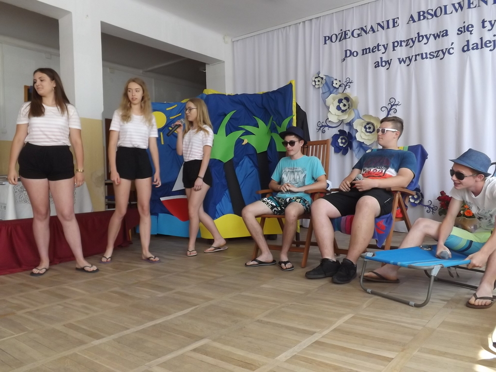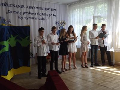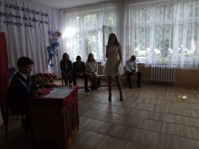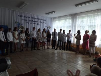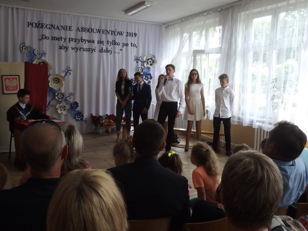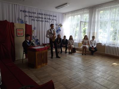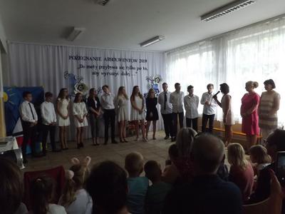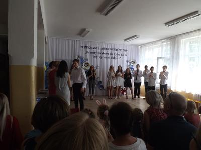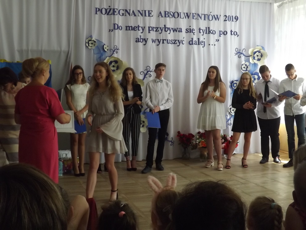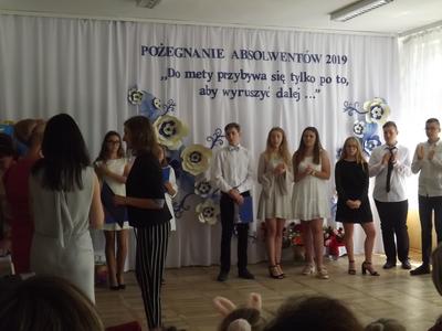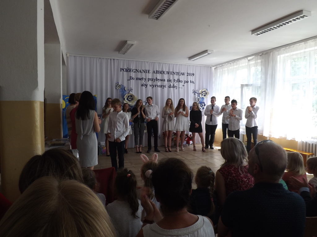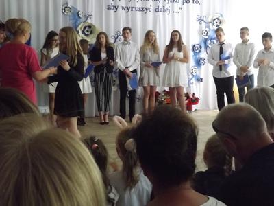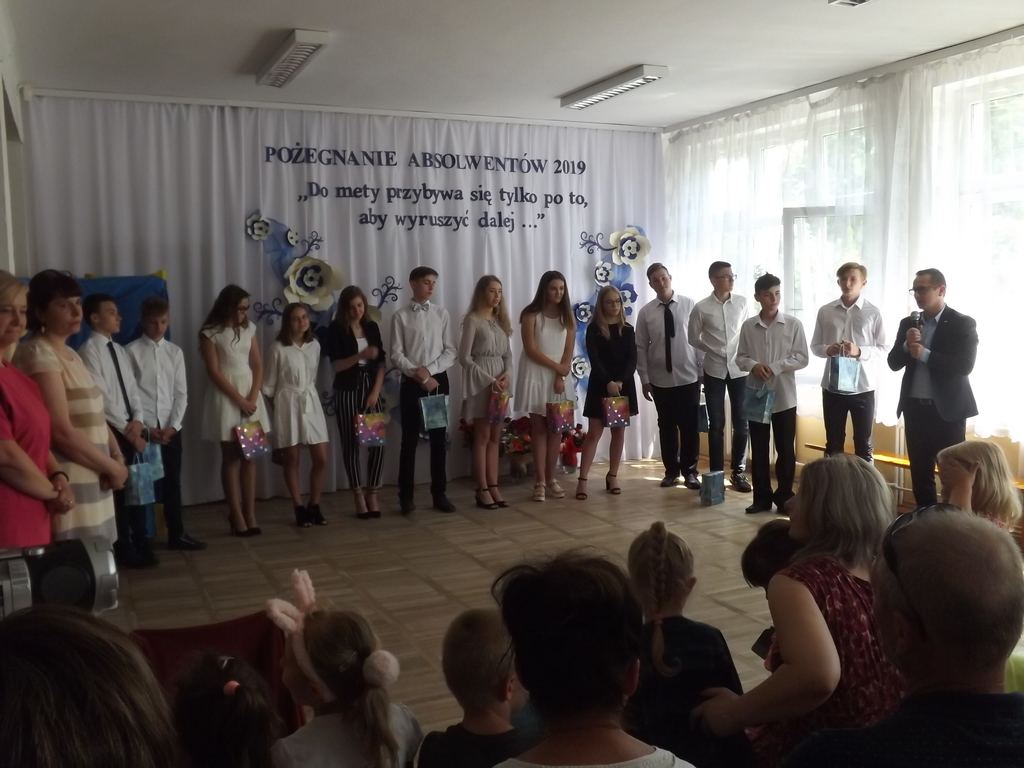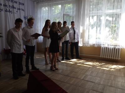 Następnie uczniowie klasy VIII, a potem klasy III gimnazjum zaprezentowali przygotowane przez siebie występy artystyczne. Przysporzyli wszystkim wiele śmiechu, wzruszeń, zadumy i radości. Nie były to tradycyjne pożegnania, a prawdziwe teatralne przedstawienia będące podsumowaniem ich wzajemnych relacji klasowych. Przywołane sytuacje pełne były śmiesznych dialogów, dystansu fo siebie, ale też wzruszających piosenek i gry na saksofonie w wykonaniu uczniów. Na koniec nasi absolwenci skierowali słowa podziękowań do wszystkich nauczycieli, wychowawców i rodziców. Nie zabrakło łez i wzruszeń. Następnie wręczono uczniom dyplomy Absolwentów, a rodzicom podziękowania za okazywaną pomoc i zaangażowanie przez wszystkie lata.