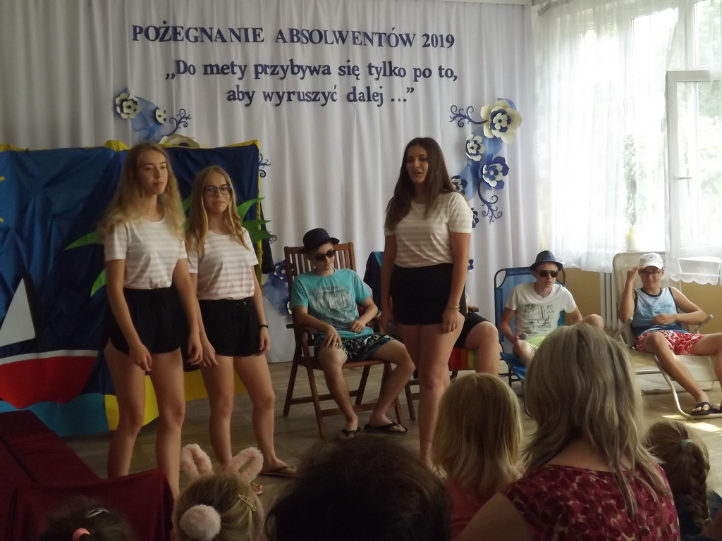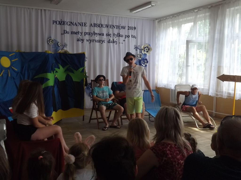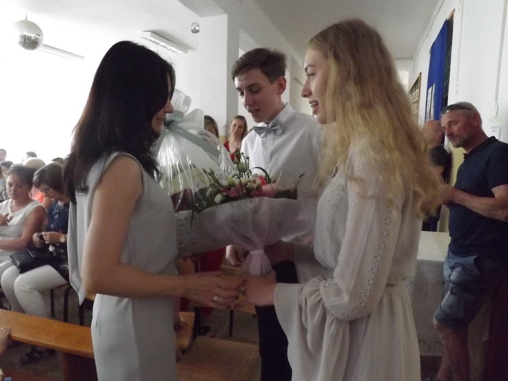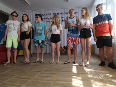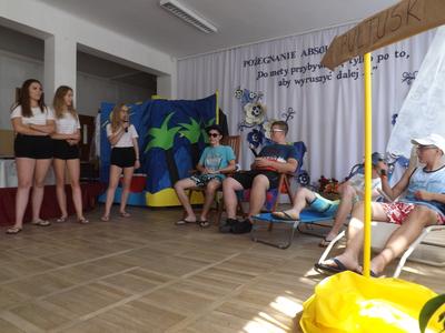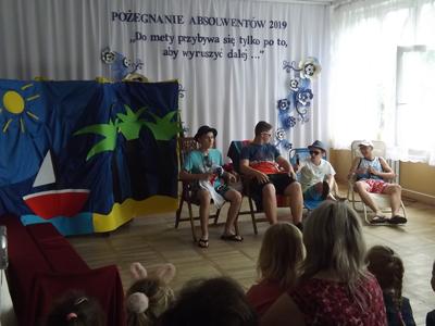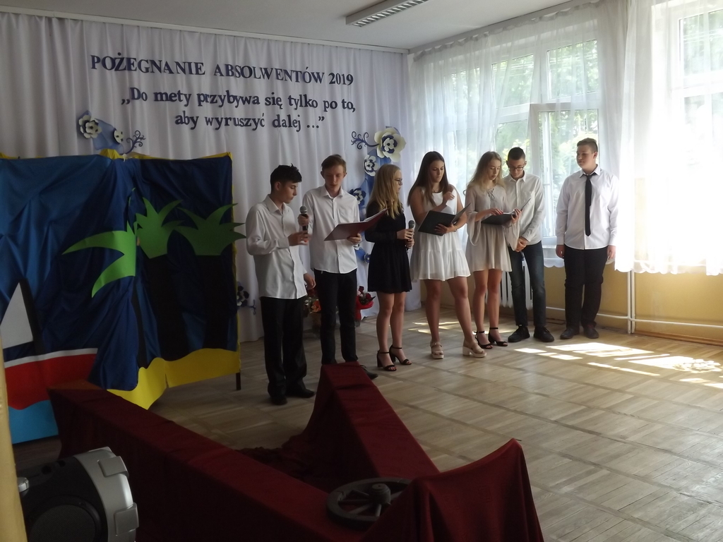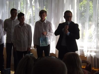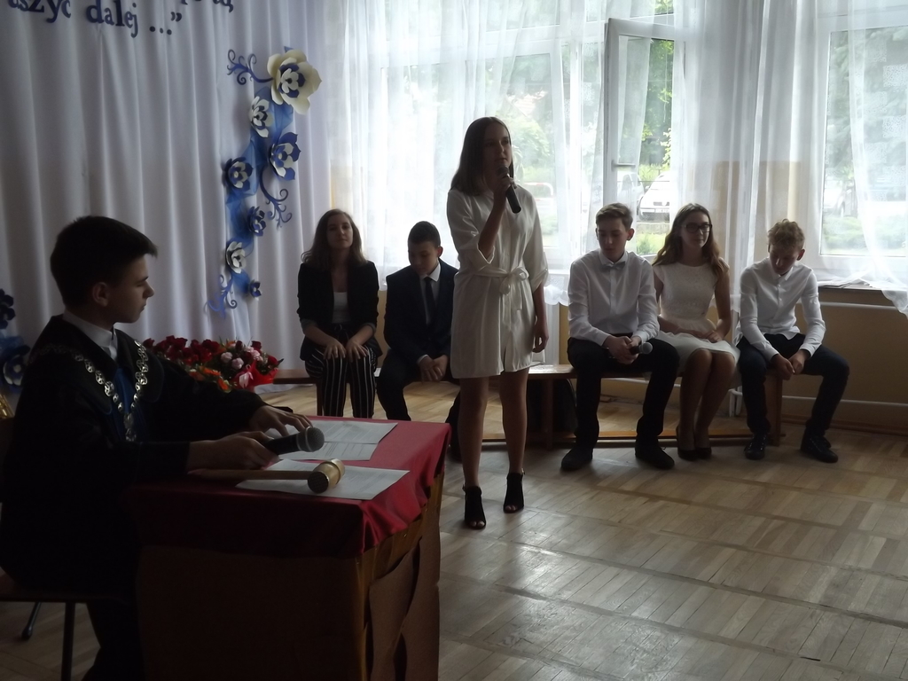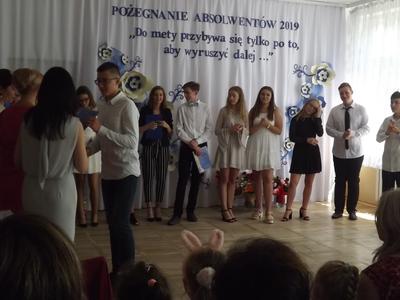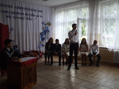 Następnie uczniowie klasy VIII, a potem klasy III gimnazjum zaprezentowali przygotowane przez siebie występy artystyczne. Przysporzyli wszystkim wiele śmiechu, wzruszeń, zadumy i radości. Nie były to tradycyjne pożegnania, a prawdziwe teatralne przedstawienia będące podsumowaniem ich wzajemnych relacji klasowych. Przywołane sytuacje pełne były śmiesznych dialogów, dystansu fo siebie, ale też wzruszających piosenek i gry na saksofonie w wykonaniu uczniów. Na koniec nasi absolwenci skierowali słowa podziękowań do wszystkich nauczycieli, wychowawców i rodziców. Nie zabrakło łez i wzruszeń. Następnie wręczono uczniom dyplomy Absolwentów, a rodzicom podziękowania za okazywaną pomoc i zaangażowanie przez wszystkie lata.