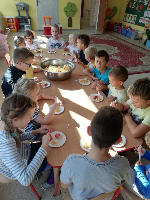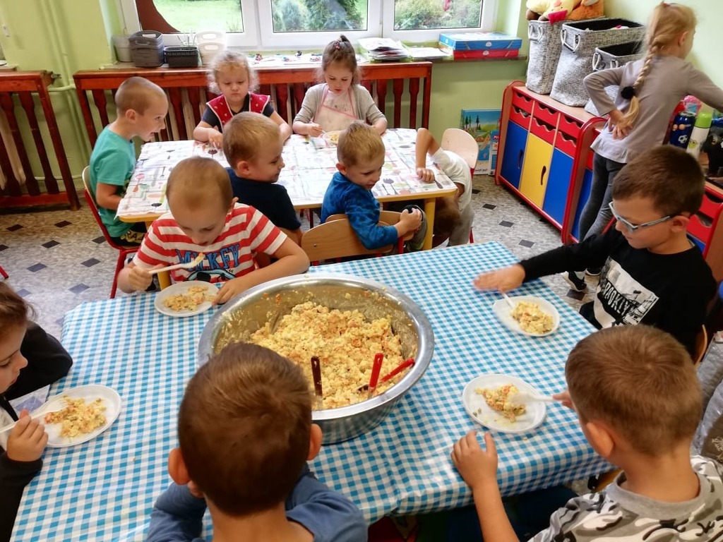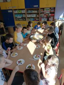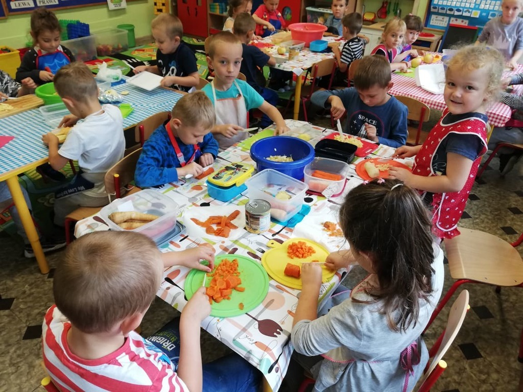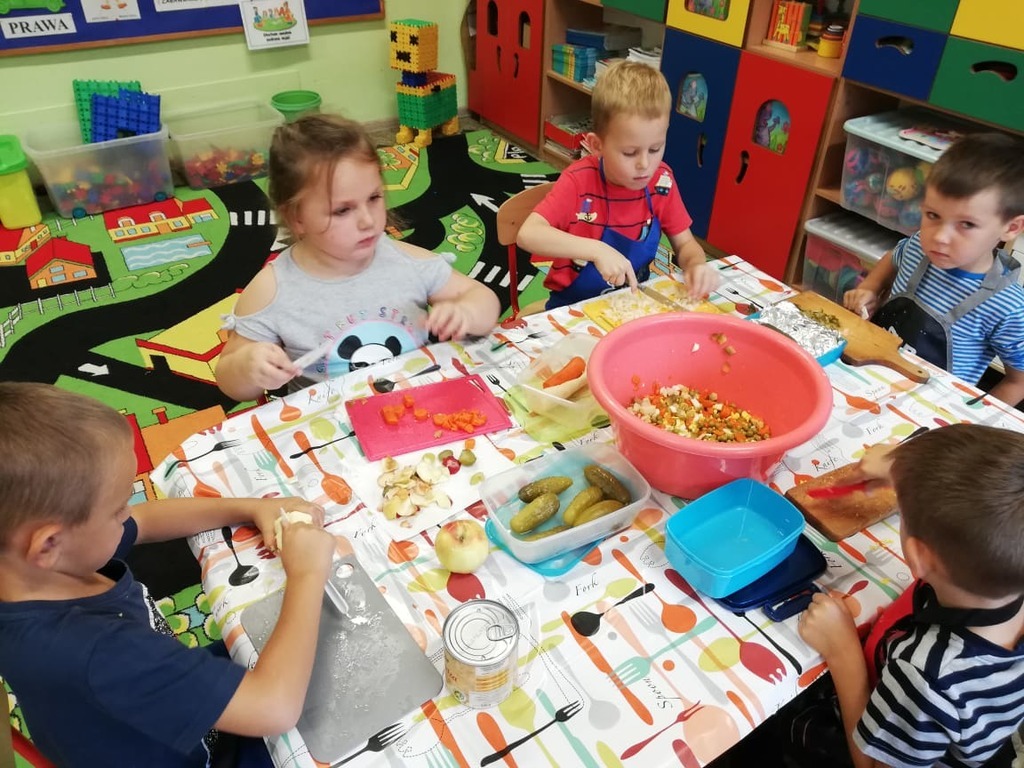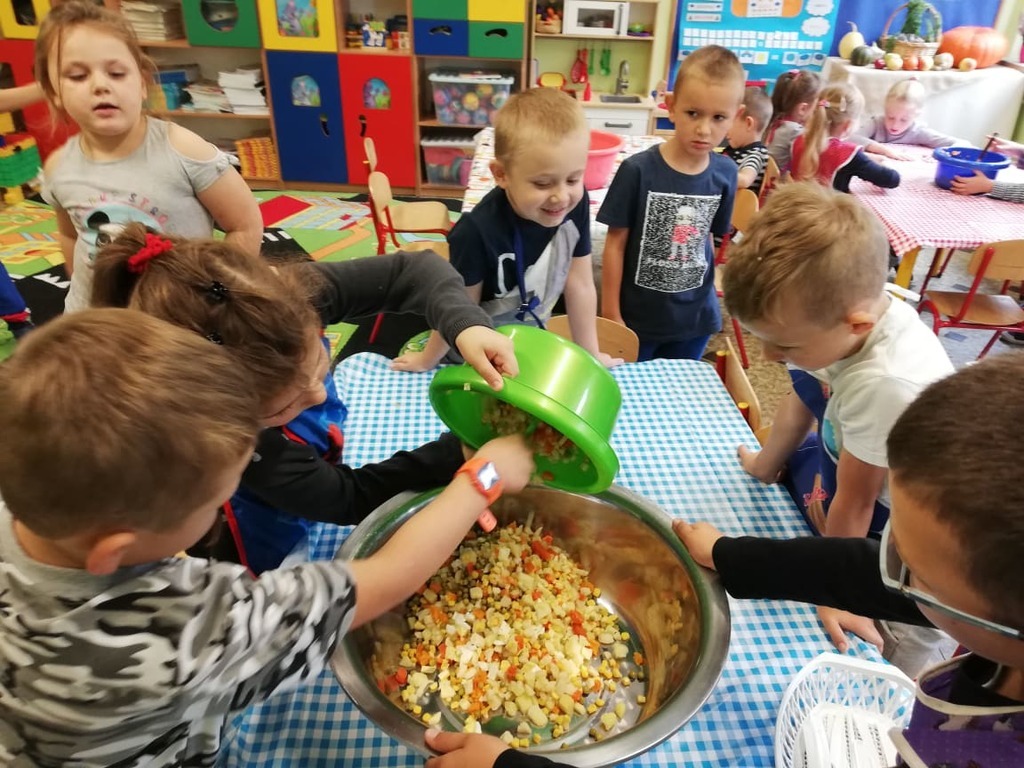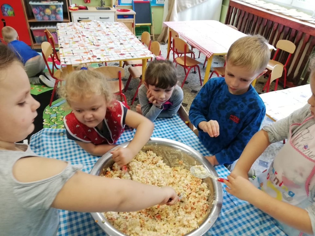 Przedszkolaki z naszego przedszkola zamieniły się w kucharzy. Grupa Motylków wykonała sałatkę jarzynową, a grupa krasnoludków wraz z klasą III SP sałatkę owocową. Pracę dzieci rozpoczęły od starannego umycia rąk . Następnie nauczycielki przypomniały zasady bezpiecznego korzystania z przyborów kuchennych. Przygotowane przedszkolaki zasiadły do stołów gdzie czekały na nich warzywa, owoce, deski do krojenia i noże. Rozpoczęło się wielkie krojenie. Gdy wszystkie składniki były dokładnie pokrojone nastąpił moment wymieszania składników. Sałatki były wyśmienite. Taka zdrowa, samodzielnie zrobiona skusiła nawet niejadków.