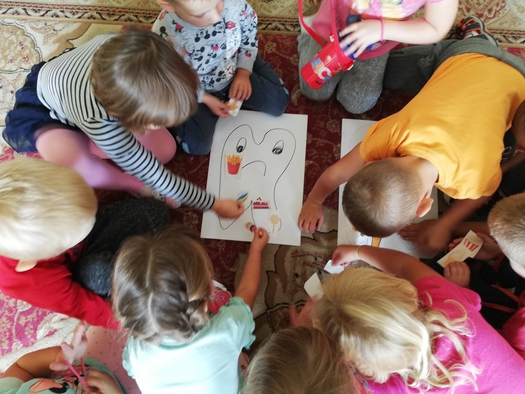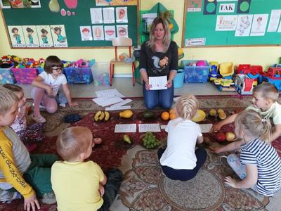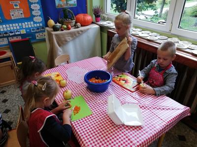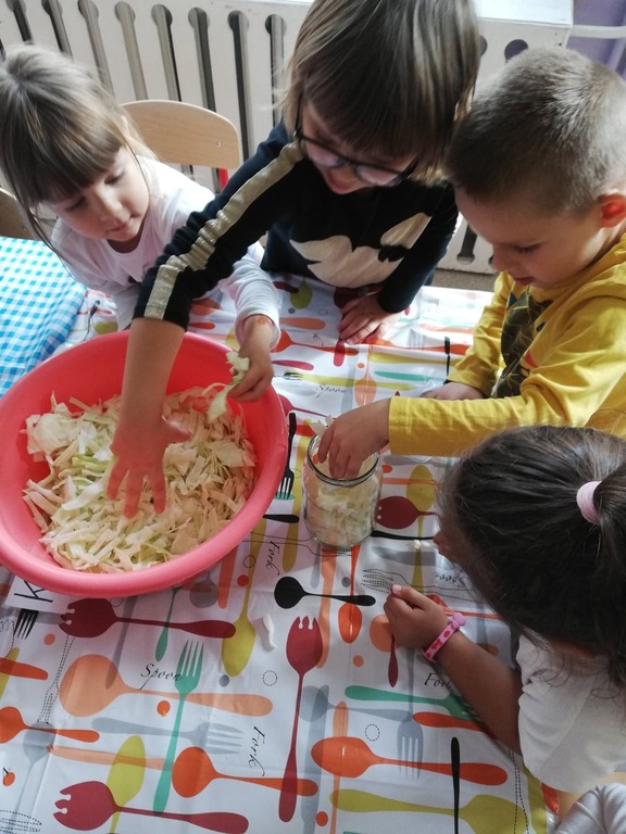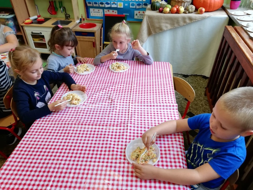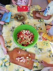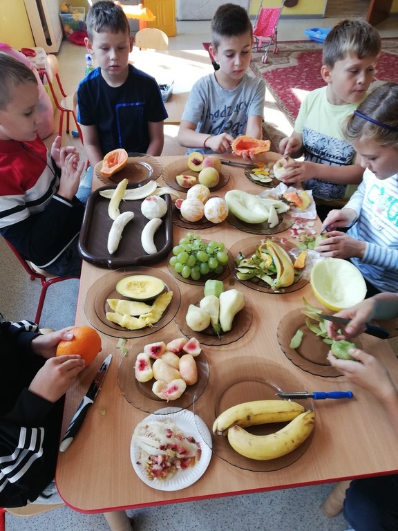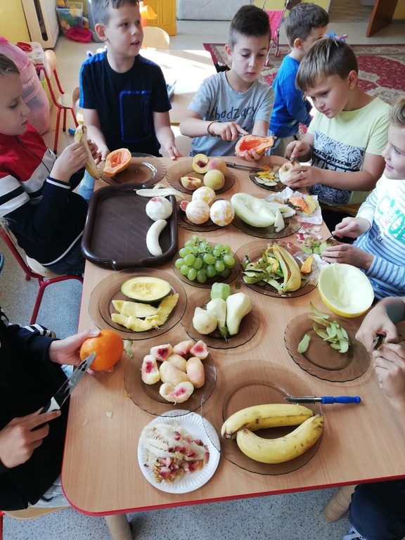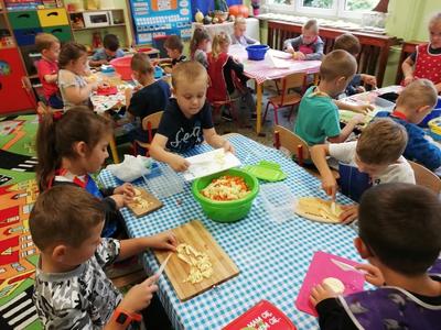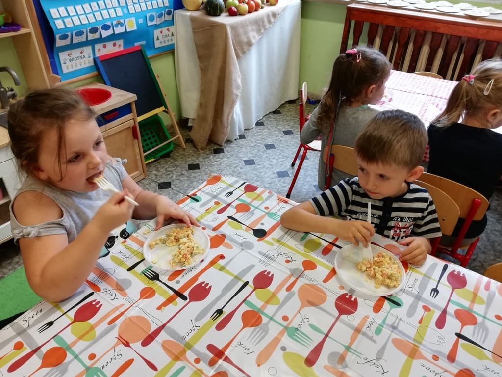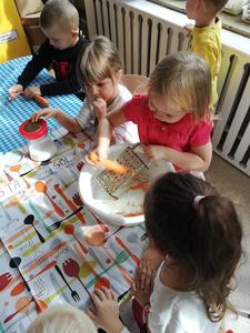 Przedszkolaki z naszego przedszkola zamieniły się w kucharzy. Grupa Motylków wykonała sałatkę jarzynową, a grupa krasnoludków wraz z klasą III SP sałatkę owocową. Pracę dzieci rozpoczęły od starannego umycia rąk . Następnie nauczycielki przypomniały zasady bezpiecznego korzystania z przyborów kuchennych. Przygotowane przedszkolaki zasiadły do stołów gdzie czekały na nich warzywa, owoce, deski do krojenia i noże. Rozpoczęło się wielkie krojenie. Gdy wszystkie składniki były dokładnie pokrojone nastąpił moment wymieszania składników. Sałatki były wyśmienite. Taka zdrowa, samodzielnie zrobiona skusiła nawet niejadków.