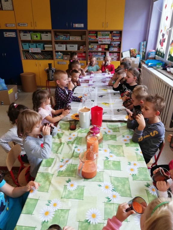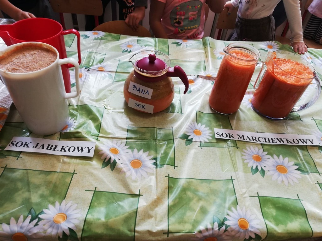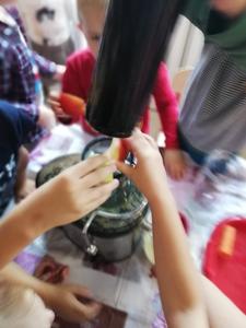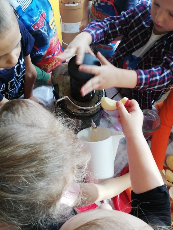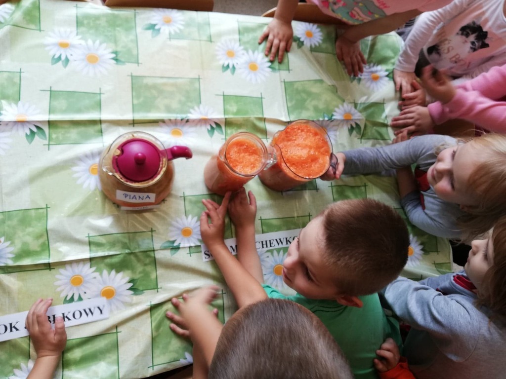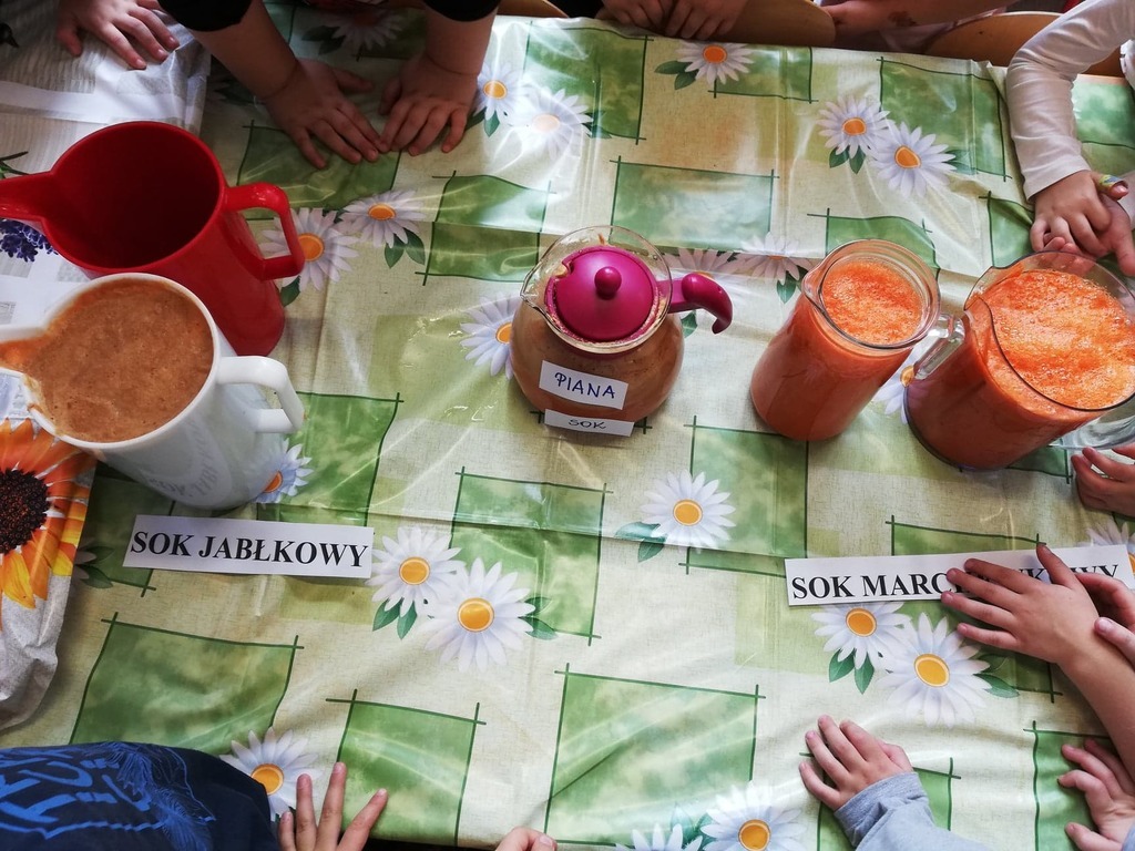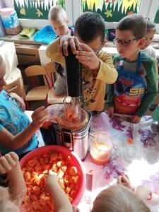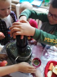 Przedszkolaki ROBIĄ SOKI OWOCOWE I WARZYWNE „Kto soki pije, ten długo żyje!” Dzieci z naszego przedszkola poznały warzywa i owoce pochodzące z sadów i ogrodów, te krajowe i te egzotyczne. Oglądały, opisywały, liczyły i porównywały je na zajęciach. Wszyscy dobrze wiedzą jakie bogate w witaminy są soki owocowe czy warzywne. Warto pomóc dziecku polubić je. Soki to nie tylko doskonałe źródło witamin i cennych składników. Przekonaliśmy się o tym podczas robienia i picia soków przez dzieci. Dzieci poznały zasady bezpieczeństwa oraz higienicznego przygotowania posiłków. Po zdobyciu wiedzy teoretycznej pełne zainteresowania i ciekawości przystąpiły do mycia owoców i warzyw, później już pozostało wrzucenie ich do sokowirówki i sok gotowy. Wspólna degustacja zachęciła do sporego wypicia soku. Wszystkim bardzo smakował! Nic nie zastąpi dawki witamin jak owoce i warzywa, w dodatku zrobione własnoręcznie… Degustacja była udana, bezpieczeństwo zapewnione i dużo radości z wykonanej pracy !