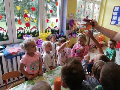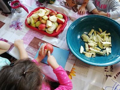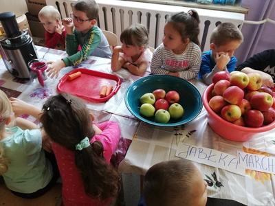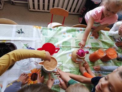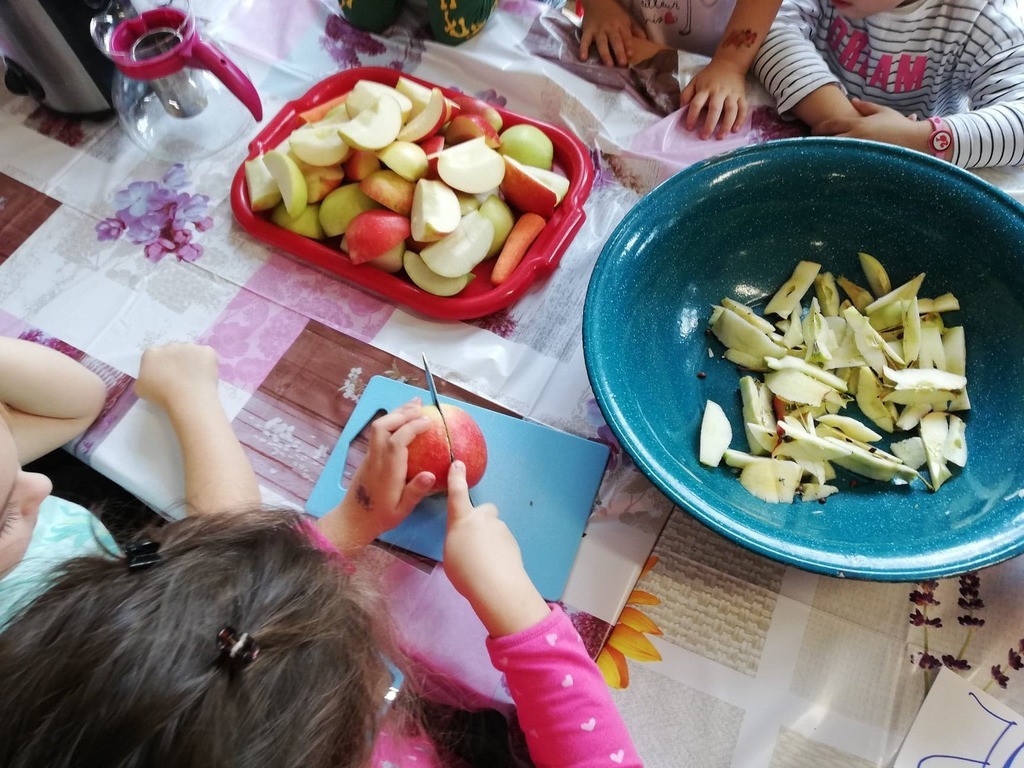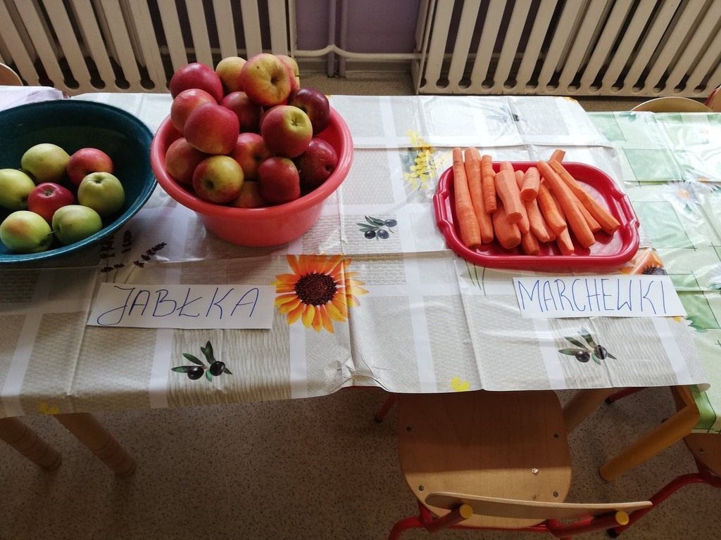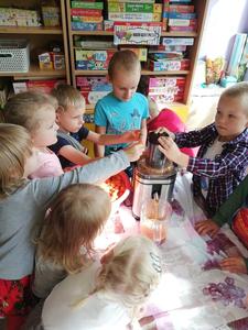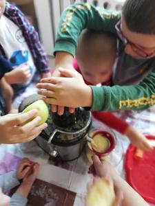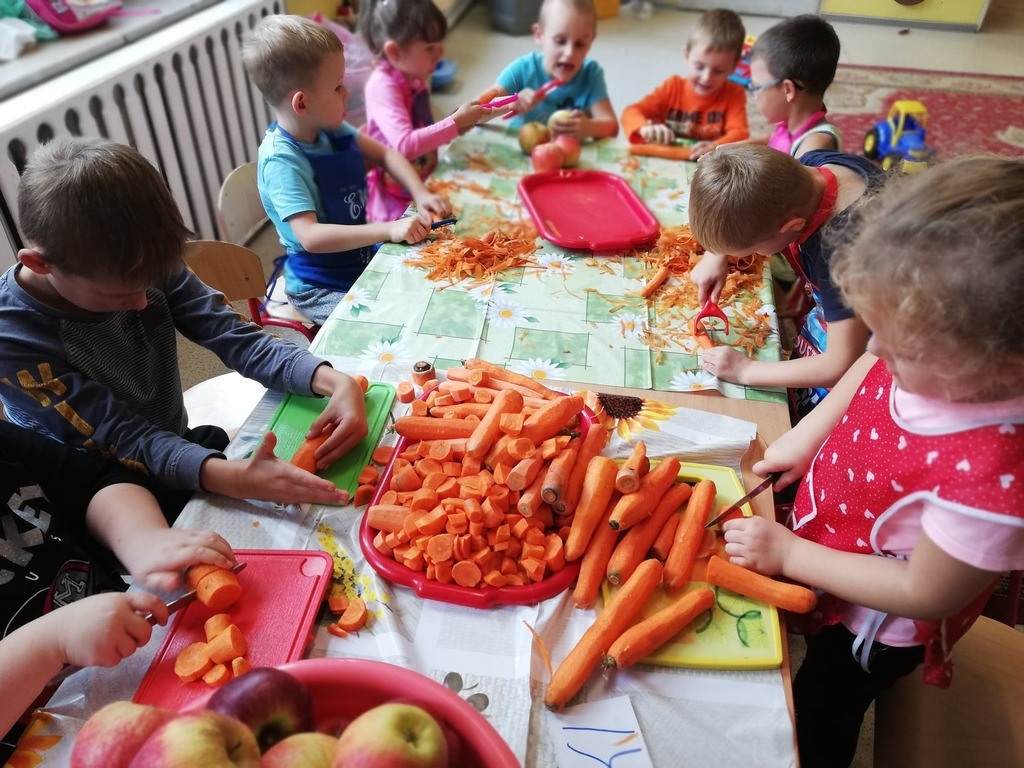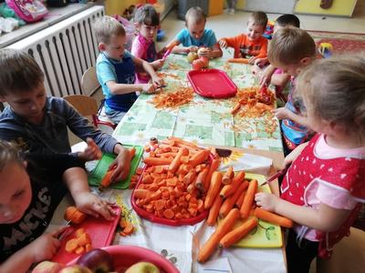 Przedszkolaki ROBIĄ SOKI OWOCOWE I WARZYWNE „Kto soki pije, ten długo żyje!” Dzieci z naszego przedszkola poznały warzywa i owoce pochodzące z sadów i ogrodów, te krajowe i te egzotyczne. Oglądały, opisywały, liczyły i porównywały je na zajęciach. Wszyscy dobrze wiedzą jakie bogate w witaminy są soki owocowe czy warzywne. Warto pomóc dziecku polubić je. Soki to nie tylko doskonałe źródło witamin i cennych składników. Przekonaliśmy się o tym podczas robienia i picia soków przez dzieci. Dzieci poznały zasady bezpieczeństwa oraz higienicznego przygotowania posiłków. Po zdobyciu wiedzy teoretycznej pełne zainteresowania i ciekawości przystąpiły do mycia owoców i warzyw, później już pozostało wrzucenie ich do sokowirówki i sok gotowy. Wspólna degustacja zachęciła do sporego wypicia soku. Wszystkim bardzo smakował! Nic nie zastąpi dawki witamin jak owoce i warzywa, w dodatku zrobione własnoręcznie… Degustacja była udana, bezpieczeństwo zapewnione i dużo radości z wykonanej pracy !