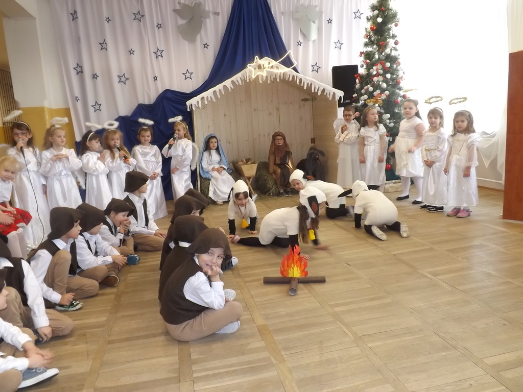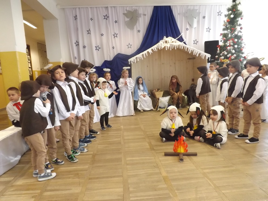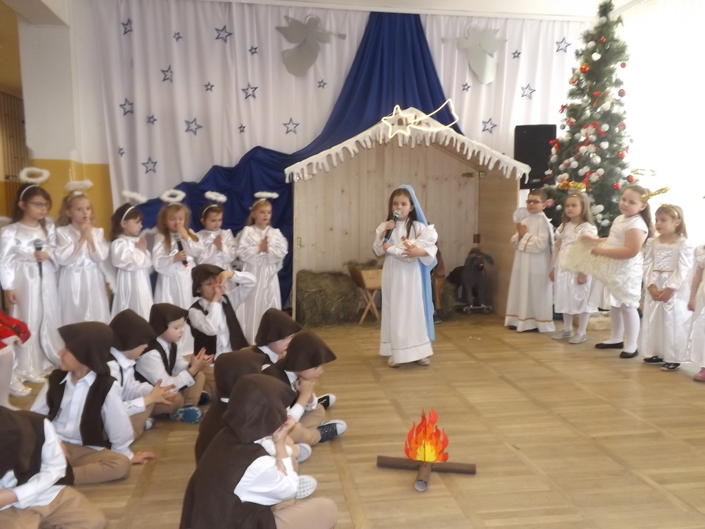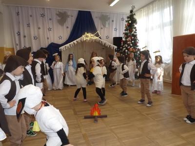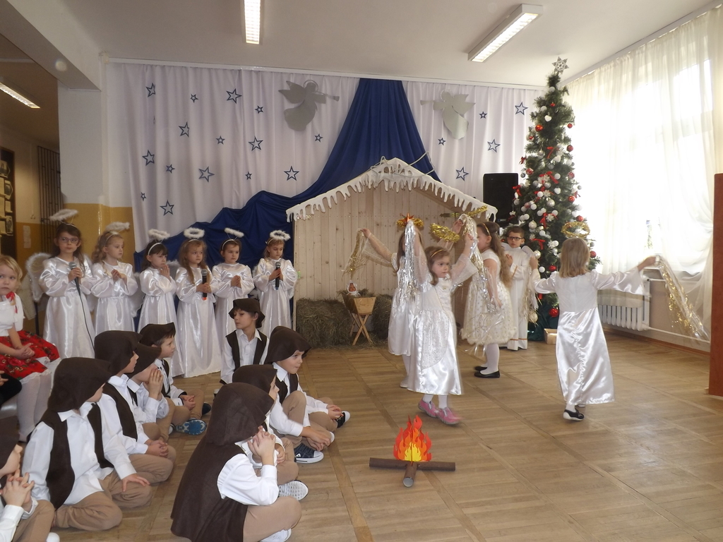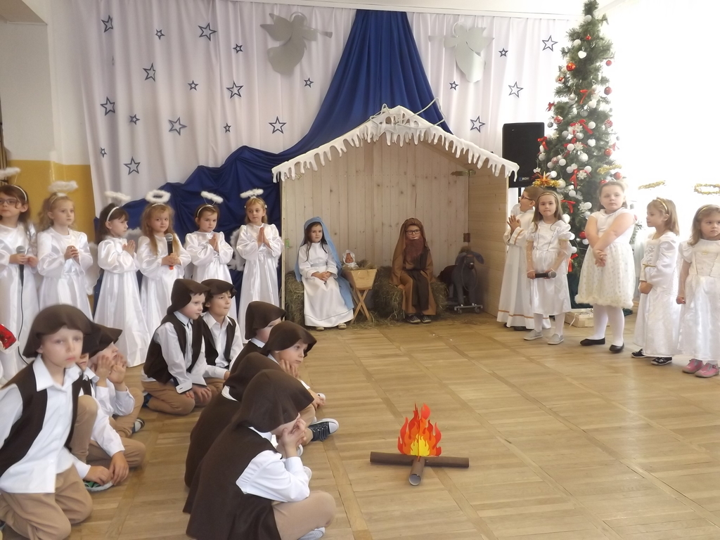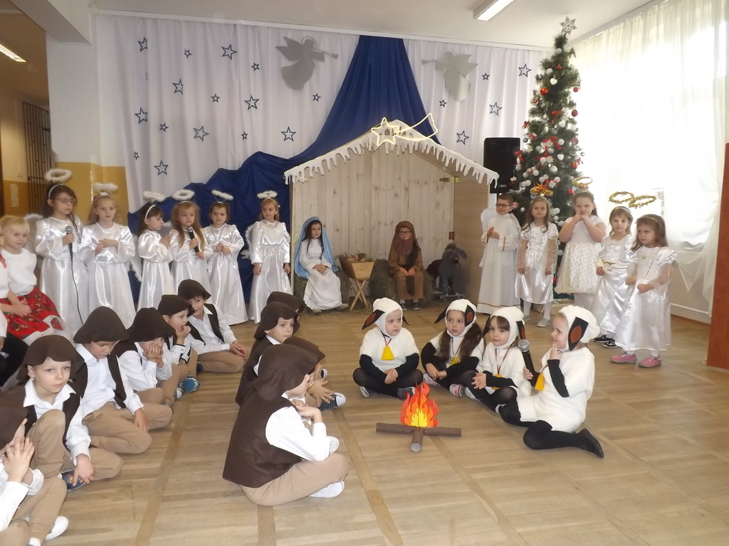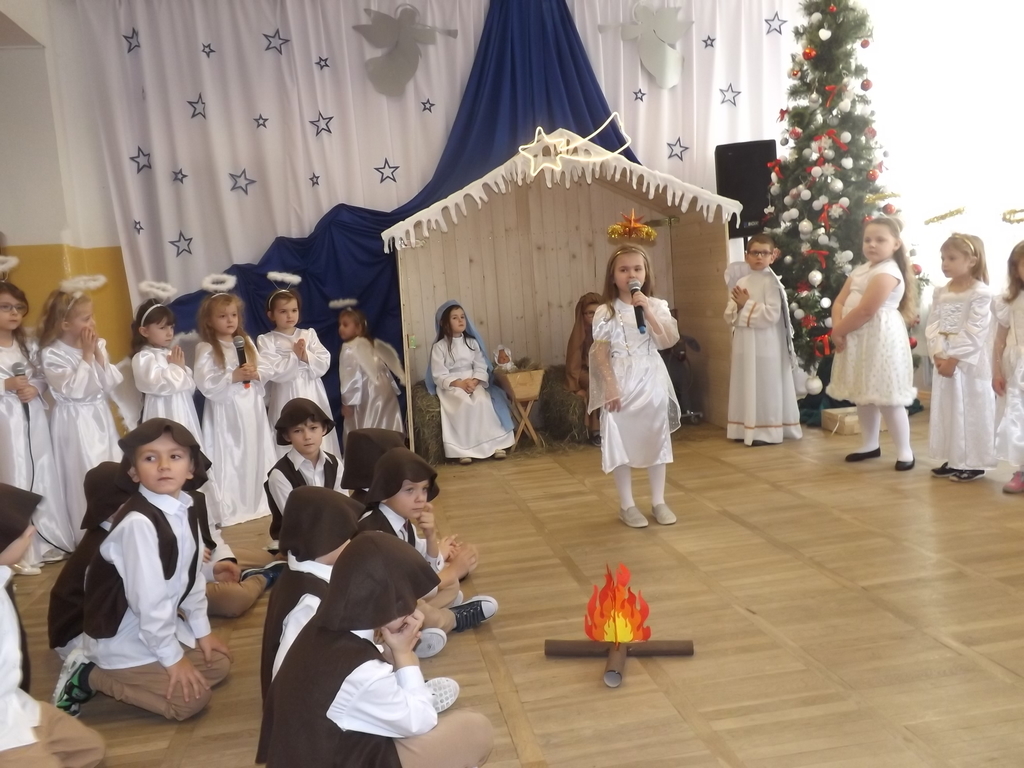 Z okazji nadchodzących Świąt Bożego Narodzenia, 20 grudnia w naszej szkole wystawione zostały jasełka, tradycyjnie w wykonaniu najmłodszych. Mali aktorzy prezentowali się wspaniale na tle bożonarodzeniowej dekoracji wykonanej przez Panie z grup przedszkolnych. Wszyscy zgromadzeni goście ulegli magii występów przedszkolaków. Artyści z ogromnym przejęciem i zaangażowaniem wiernie odtwarzali swoje role, prezentując umiejętności aktorskie i wokalne. Scenariusz jasełek zawierał najważniejsze wydarzenia towarzyszące narodzinom Jezusa. Na koniec mali aktorzy nagrodzeni zostali gromkimi brawami. Po przedstawieniu wszyscy zgromadzeni udali się na uroczystą wigilię szkolną, gdzie łamiąc się opłatkiem składali sobie nawzajem serdeczne życzenia.