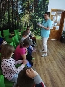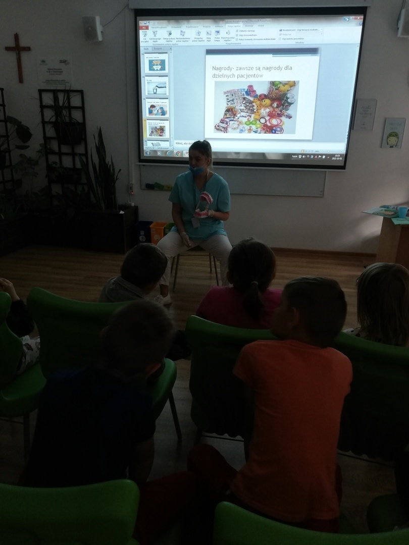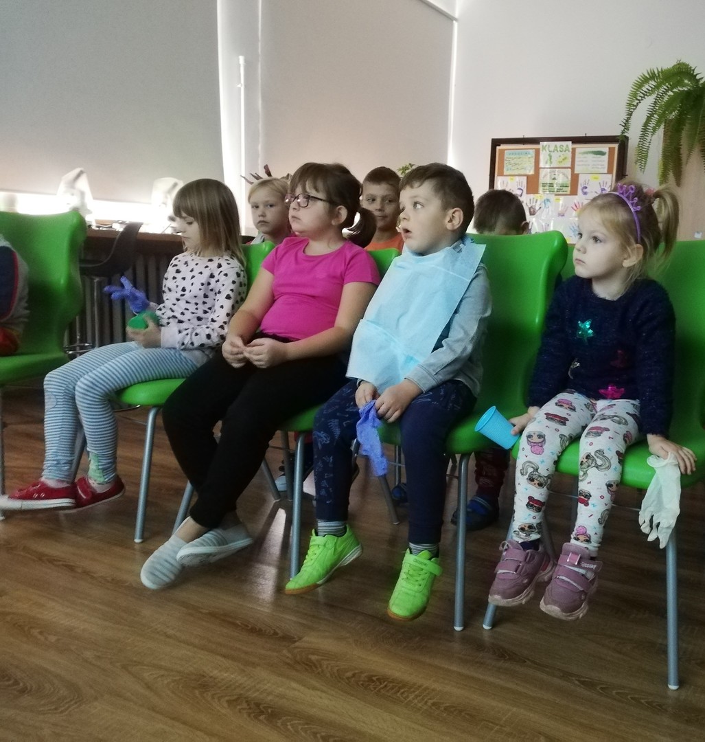 Niedawno gościliśmy w naszym przedszkolu Panią Katarzynę, ciocię Filipka, która pracuje jako asystentka stomatologa. Głównym celem spotkania było uświadomienie dzieciom konieczności dbania o higienę jamy ustnej oraz zmniejszenie obawy wśród najmłodszych przed wizytą w gabinecie stomatologicznym.