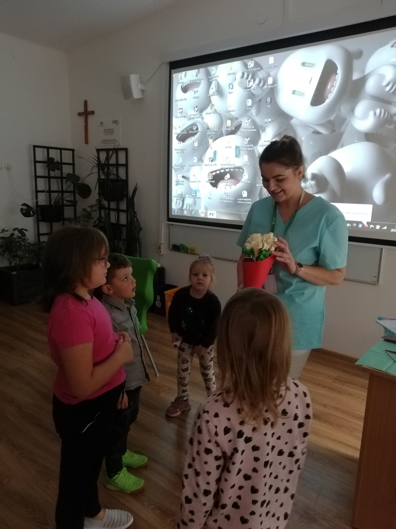 Na zakończenie każde dziecko otrzymało upominek w postaci kolorowanki, pasty do zębów lub szczoteczki. W dowód wdzięczności przedszkolaki uhonorowały Panią Kasię bukietem kwiatów. Serdecznie dziękujemy za sympatyczna wizytę 😊