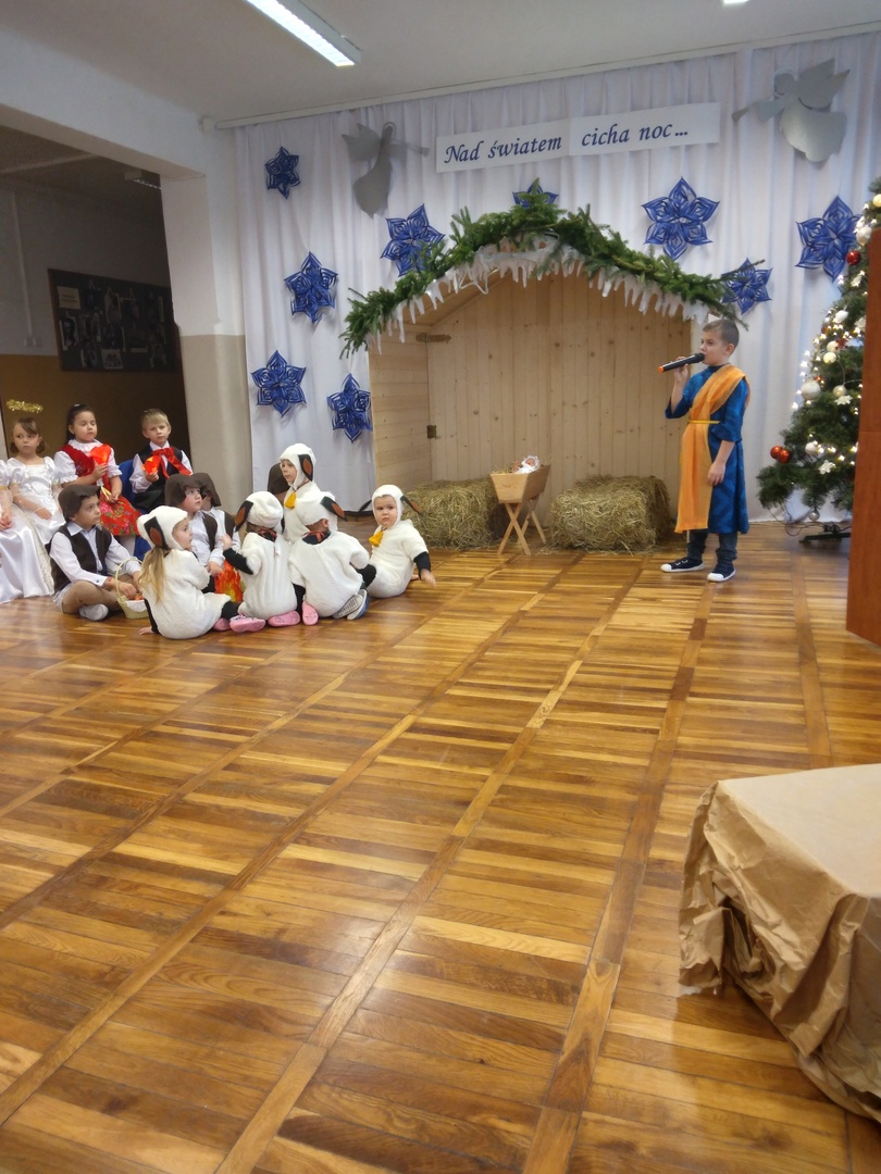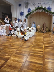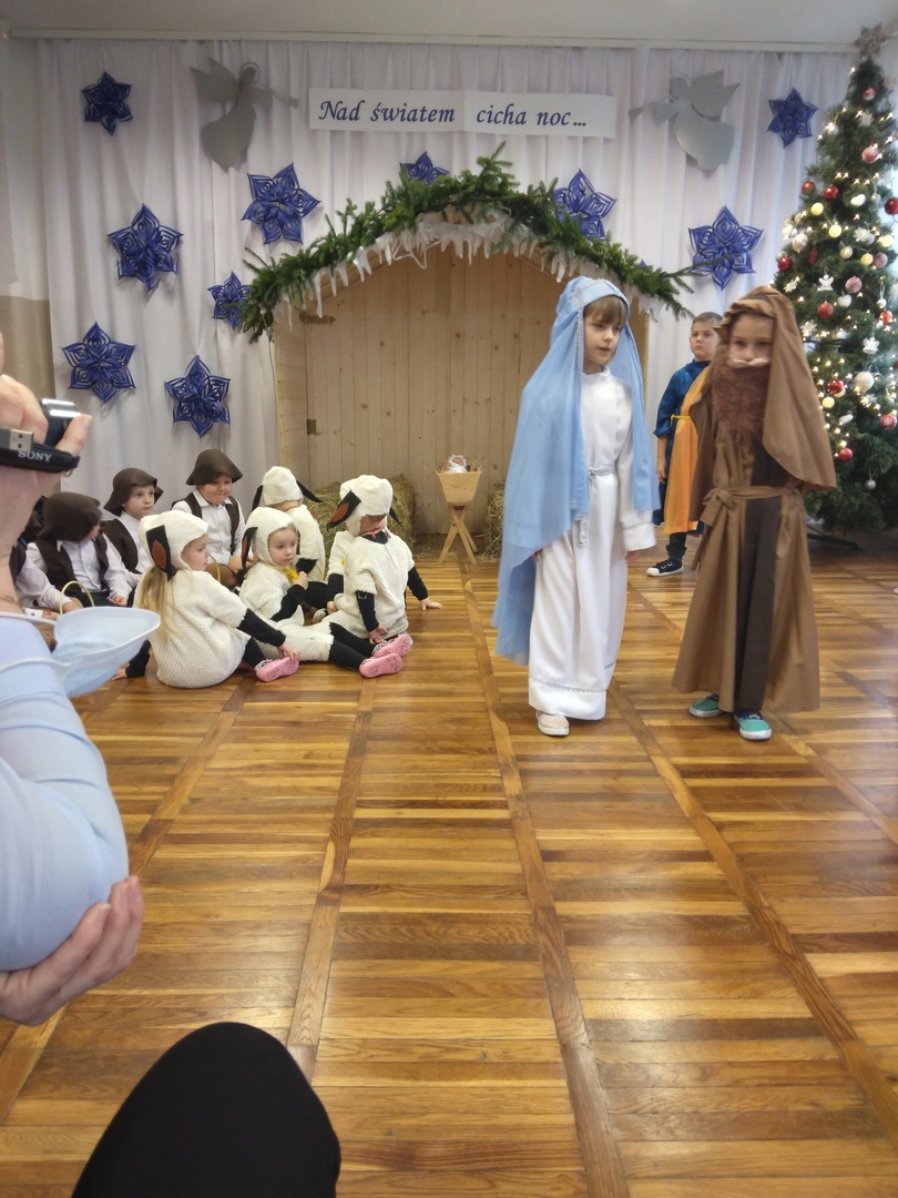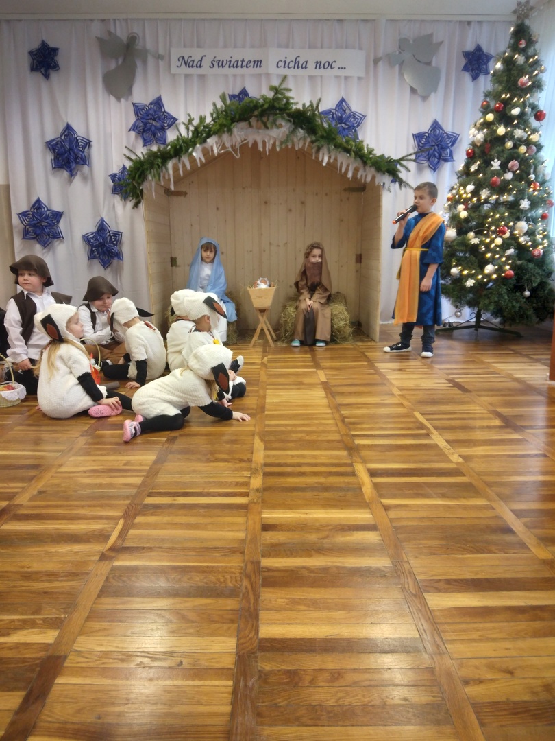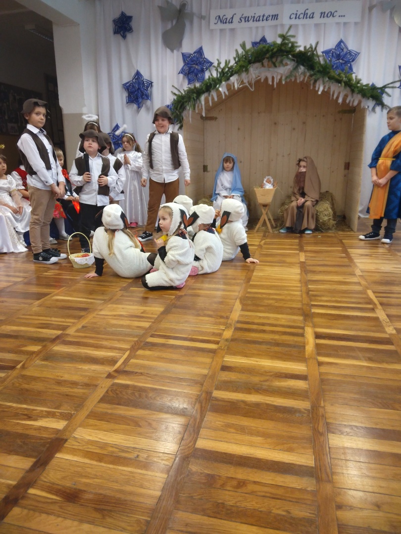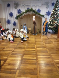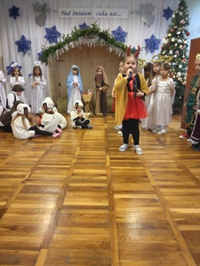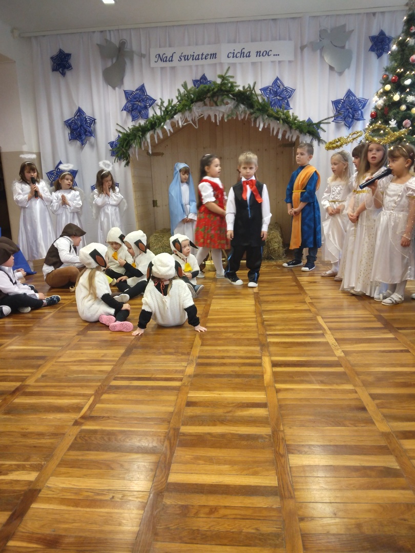 Podczas występu dzieci przedstawiły opowieść o narodzinach Dzieciątka Jezus oprawioną pastorałkami i kolędami. Scenografia oraz stroje przedszkolaków były idealnym dopełnieniem inscenizacji. Mali artyści z dużym przejęciem odtwarzali swoje role, prezentując umiejętności recytatorskie i wokalne. Zwieńczeniem widowiska były życzenia świąteczne