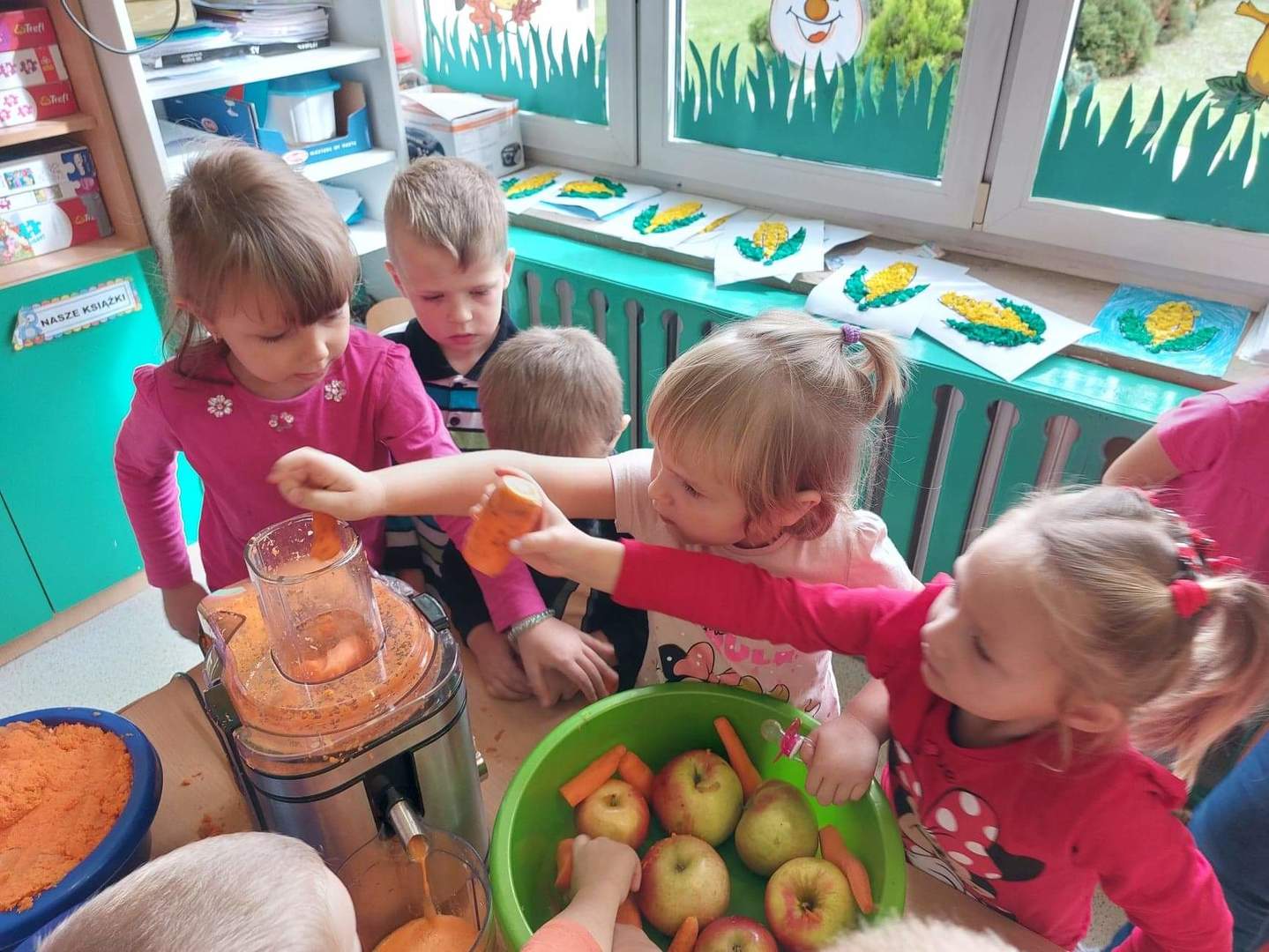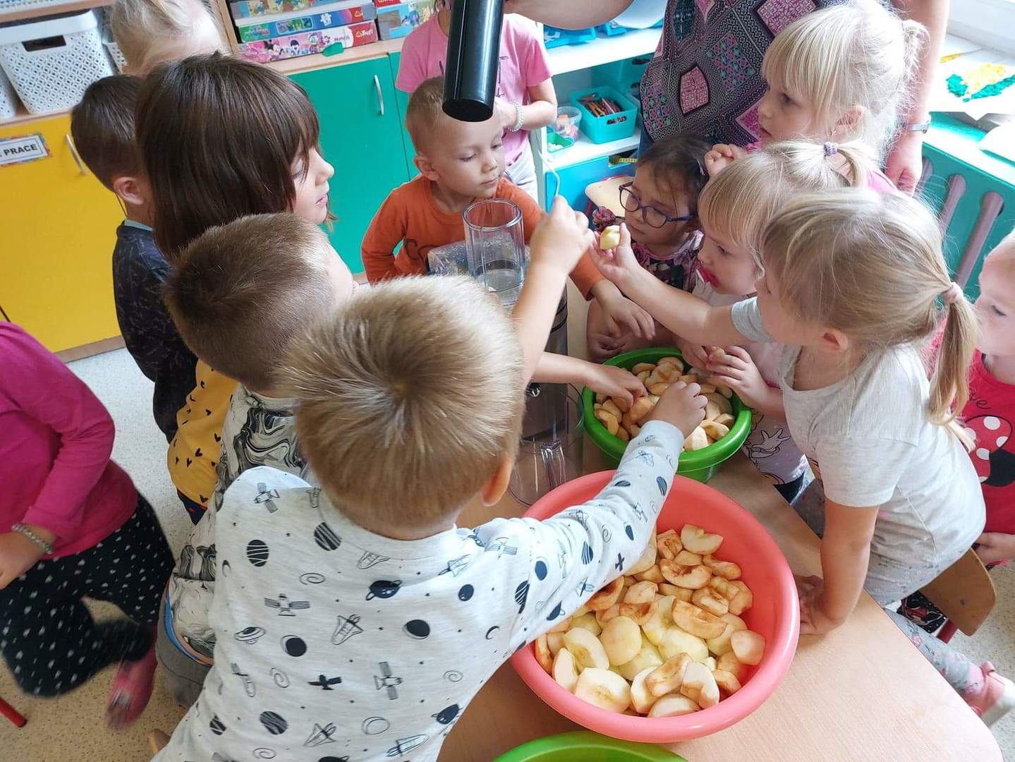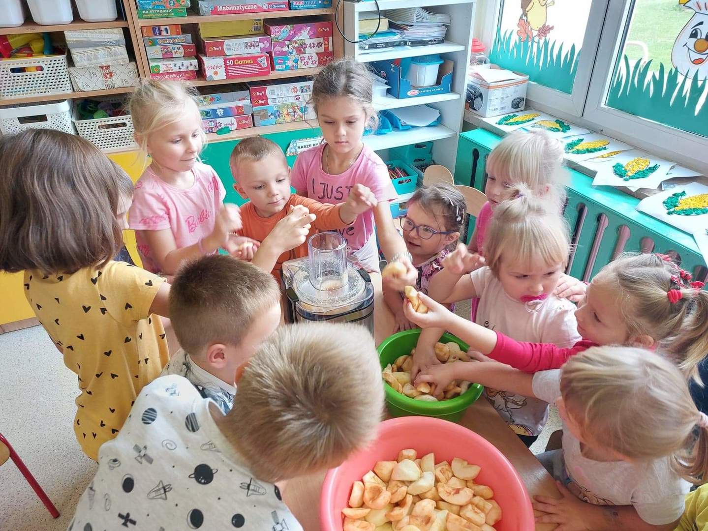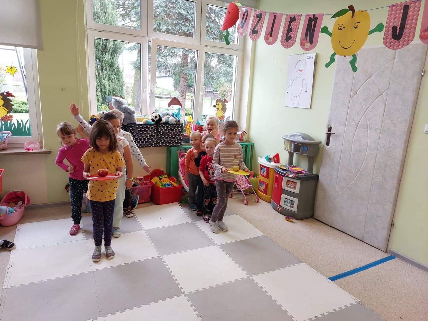 z tych owoców. Próbowały musu z jabłek, chipsy jabłkowe, a także chrupały surowe jabłuszka. Następnie na przedszkolaki czekały atrakcje – piosenki, tańce, zagadki, działania matematyczne. Wiele emocji dostarczały także dzieciom zabawy zręcznościowe i ćwiczenia ruchowe. Dzięki nim najmłodsi dowiedzieli się, że oprócz cennych walorów smakowych jabłko może posłużyć jako inspiracja do wielu konkurencji. Na koniec, pod czujnym okiem wychowawczyń, dzieci przygotowały pyszny sok jabłkowy oraz jabłkowo – marchewkowy. Organizacja Święta Jabłka w przedszkolu miała na celu zachęcanie dzieci do spożywania jabłek i jego przetworów jako źródła witamin, uświadomienie wartości odżywczych owoców dla prawidłowego rozwoju oraz dostarczenie radości ze wspólnej zabawy.