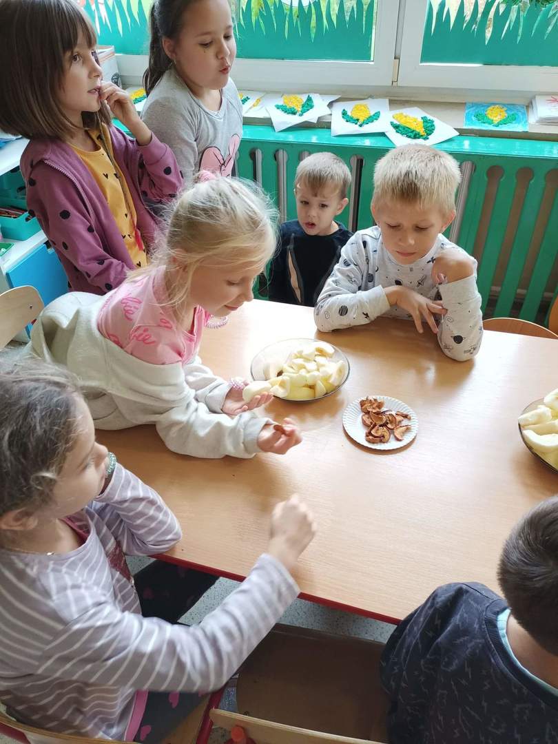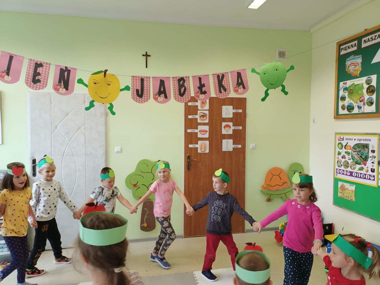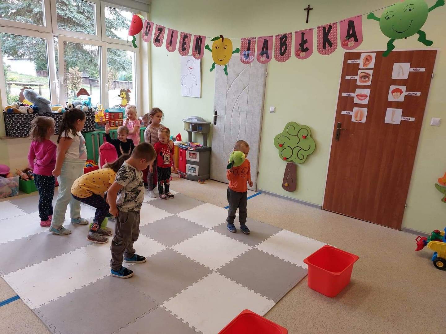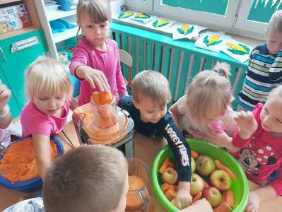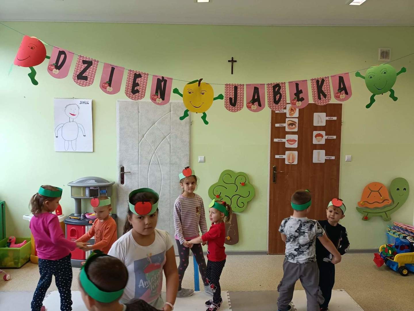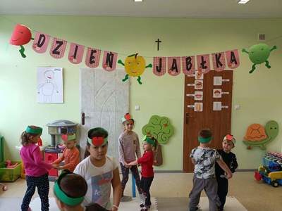 z tych owoców. Próbowały musu z jabłek, chipsy jabłkowe, a także chrupały surowe jabłuszka. Następnie na przedszkolaki czekały atrakcje – piosenki, tańce, zagadki, działania matematyczne. Wiele emocji dostarczały także dzieciom zabawy zręcznościowe i ćwiczenia ruchowe. Dzięki nim najmłodsi dowiedzieli się, że oprócz cennych walorów smakowych jabłko może posłużyć jako inspiracja do wielu konkurencji. Na koniec, pod czujnym okiem wychowawczyń, dzieci przygotowały pyszny sok jabłkowy oraz jabłkowo – marchewkowy. Organizacja Święta Jabłka w przedszkolu miała na celu zachęcanie dzieci do spożywania jabłek i jego przetworów jako źródła witamin, uświadomienie wartości odżywczych owoców dla prawidłowego rozwoju oraz dostarczenie radości ze wspólnej zabawy.