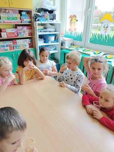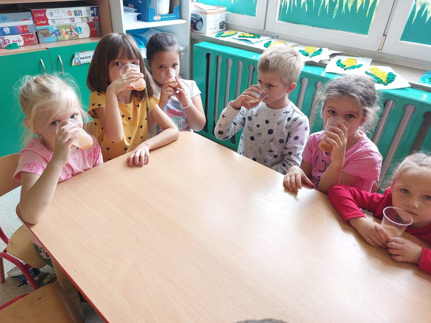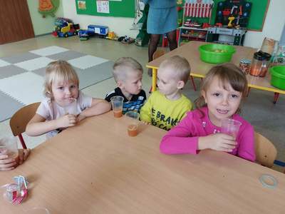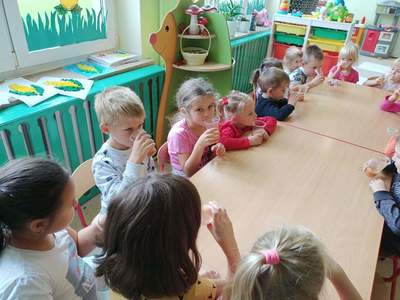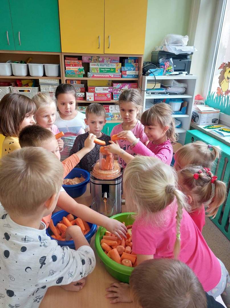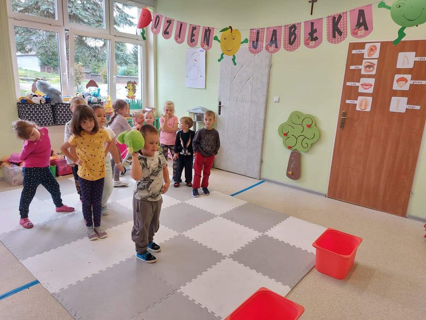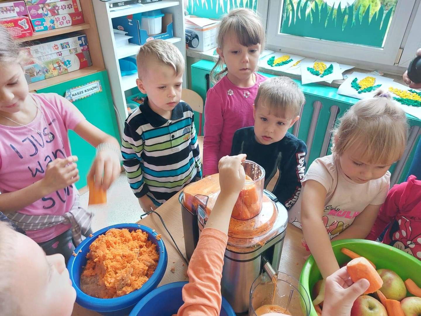 z tych owoców. Próbowały musu z jabłek, chipsy jabłkowe, a także chrupały surowe jabłuszka. Następnie na przedszkolaki czekały atrakcje – piosenki, tańce, zagadki, działania matematyczne. Wiele emocji dostarczały także dzieciom zabawy zręcznościowe i ćwiczenia ruchowe. Dzięki nim najmłodsi dowiedzieli się, że oprócz cennych walorów smakowych jabłko może posłużyć jako inspiracja do wielu konkurencji. Na koniec, pod czujnym okiem wychowawczyń, dzieci przygotowały pyszny sok jabłkowy oraz jabłkowo – marchewkowy. Organizacja Święta Jabłka w przedszkolu miała na celu zachęcanie dzieci do spożywania jabłek i jego przetworów jako źródła witamin, uświadomienie wartości odżywczych owoców dla prawidłowego rozwoju oraz dostarczenie radości ze wspólnej zabawy.
