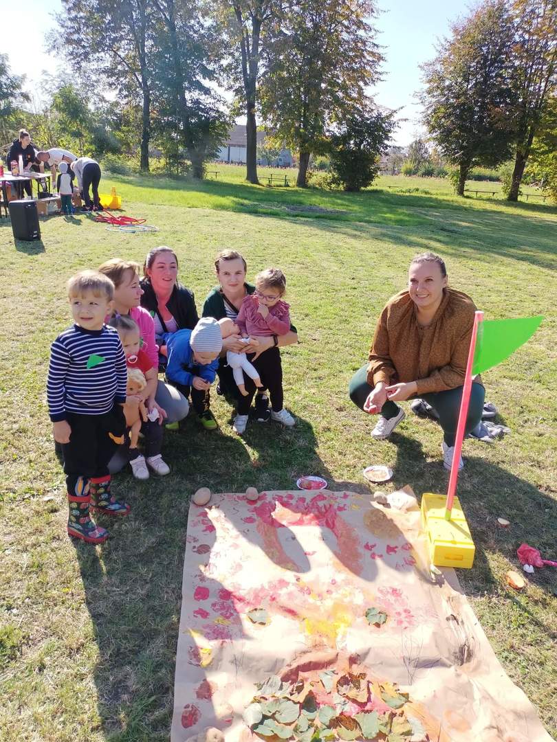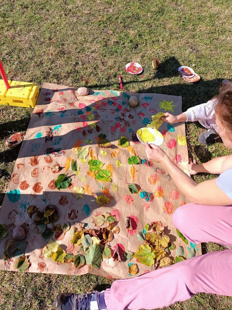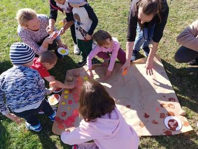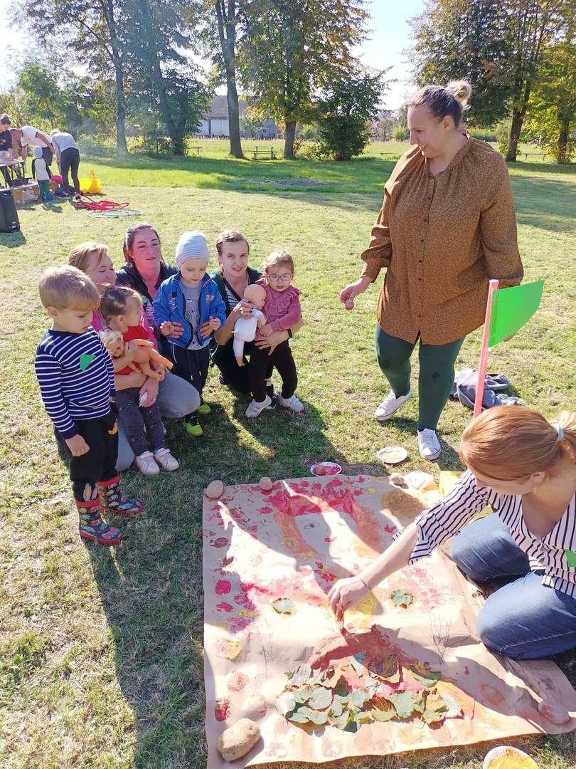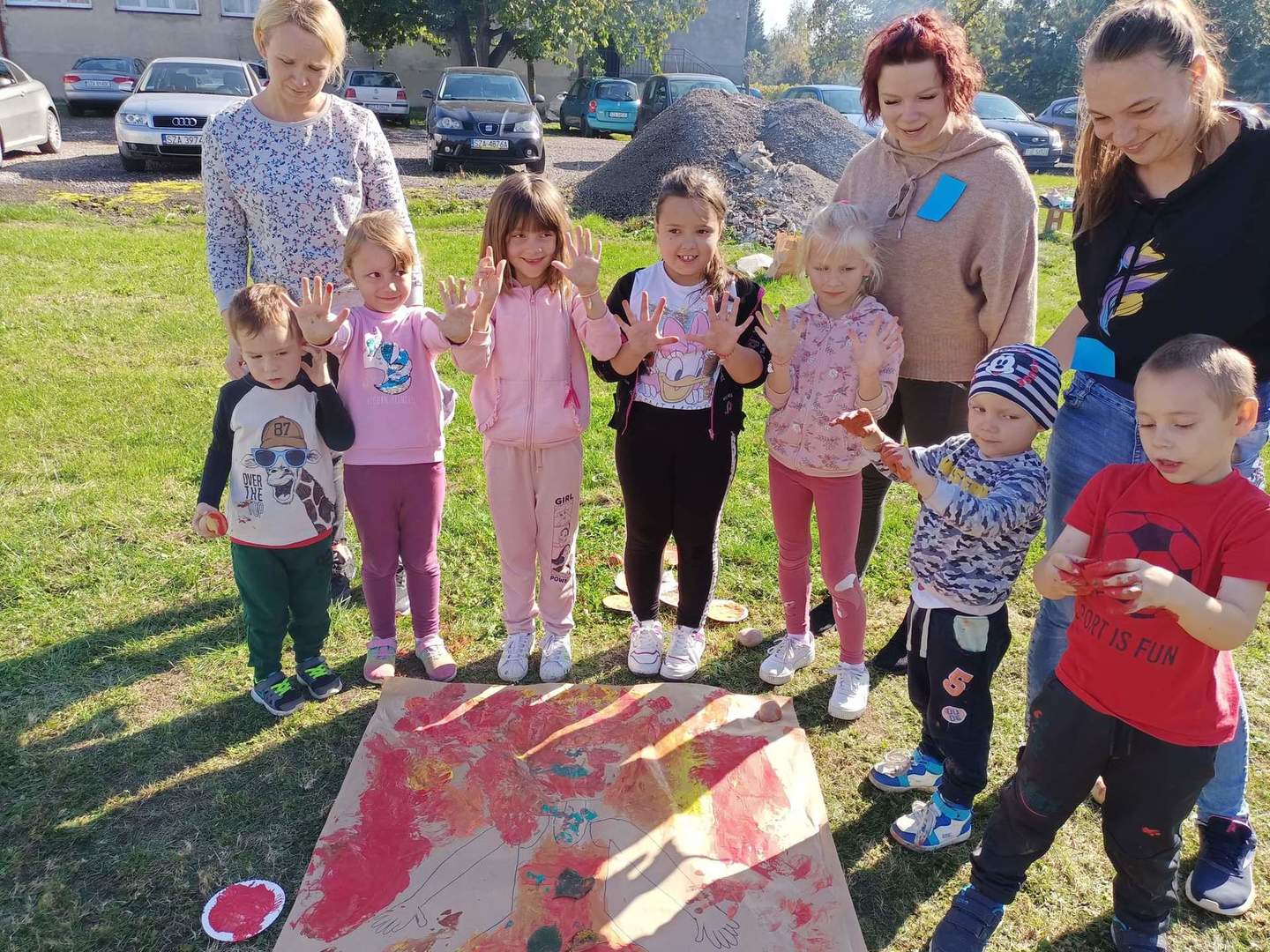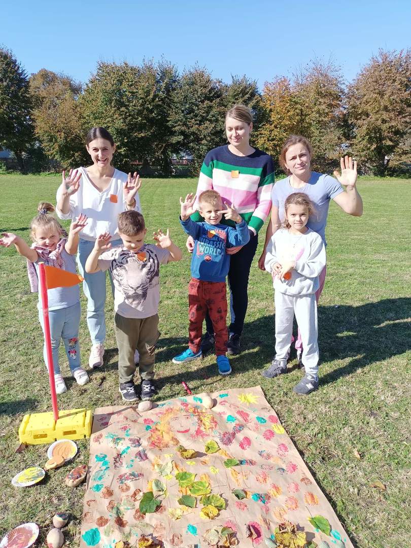 noszeniu ziemniaka na łyżce, obieraniu ziemniaka na najdłuższą obierkę, skakaniu w workach czy rzutu ziemniakiem do celu. Zarówno przedszkolaki, jak i rodzice mogli pochwalić się wiedzą na temat ziemniaka i jesieni podczas Quizu. Dużo frajdy i radości sprawiło dzieciom grupowe wykonanie obrazu pt. „Pani Jesień”, wykonanego techniką stemplowania. Uwieńczeniem wspaniałej zabawy była uczta z pieczonych ziemniaków w żeliwnych garnkach. Pobyt na świeżym powietrzu zrobił swoje, gdyż apetyt dopisywał wszystkim uczestnikom. Serdecznie dziękujemy rodzicom, którzy wzięli udział w naszej zabawie i pomogli