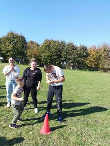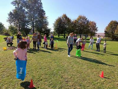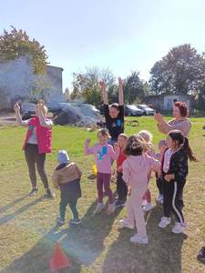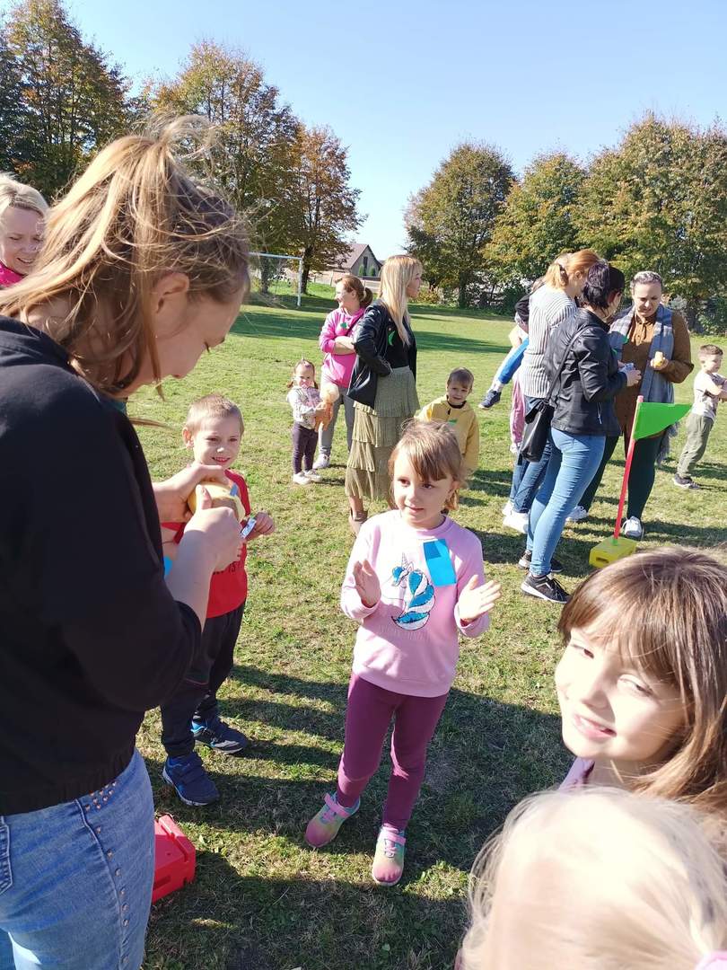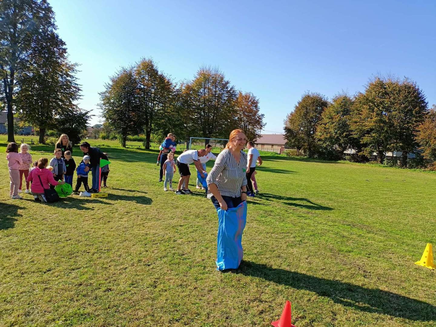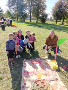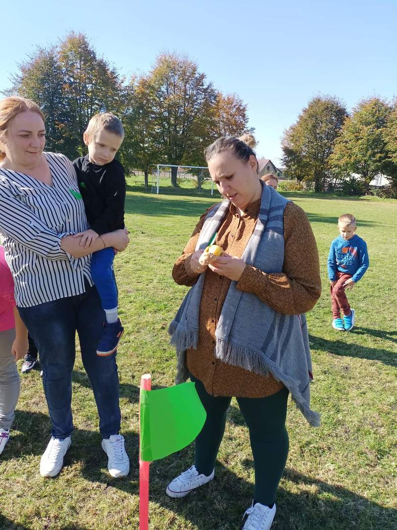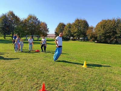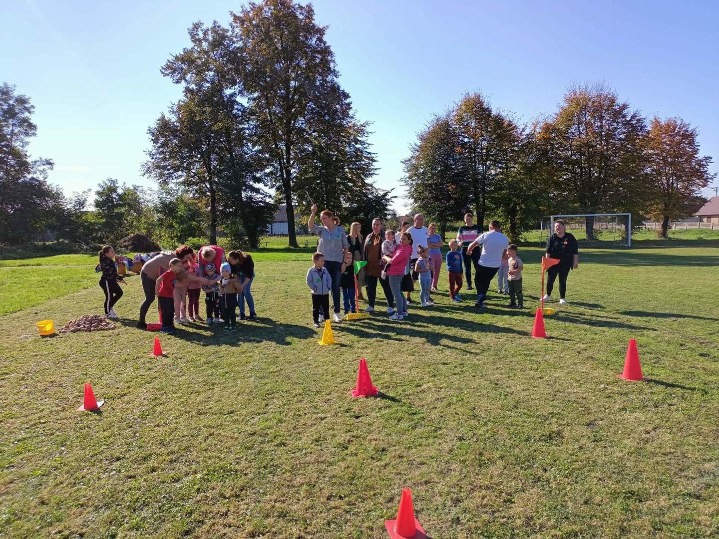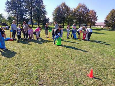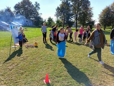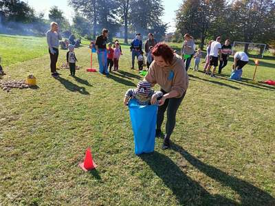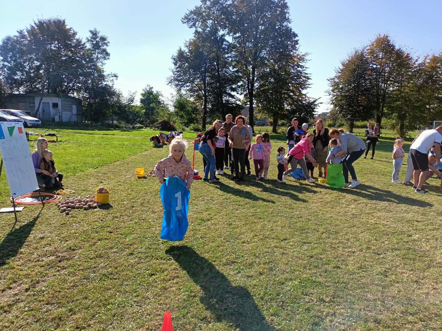 Spotkanie rozpoczęliśmy od zabaw i pląsów przy muzyce. Następnie wszyscy zebrani mogli wykazać się zwinnością w licznych zmaganiach sprawnościowych: zbieraniu ziemniaków,