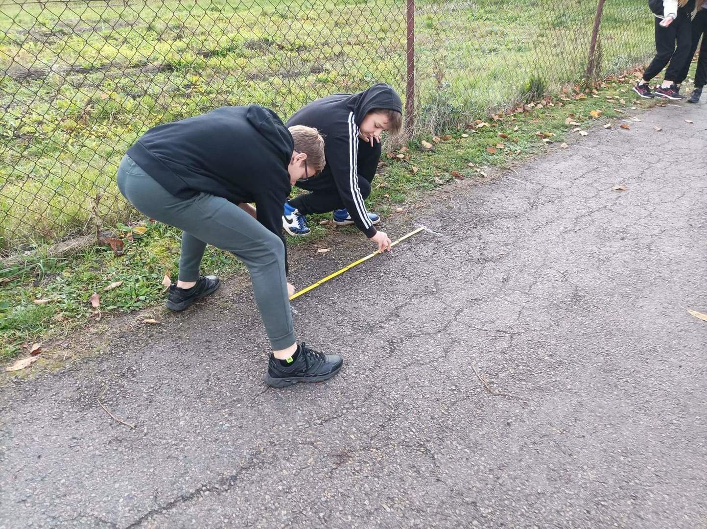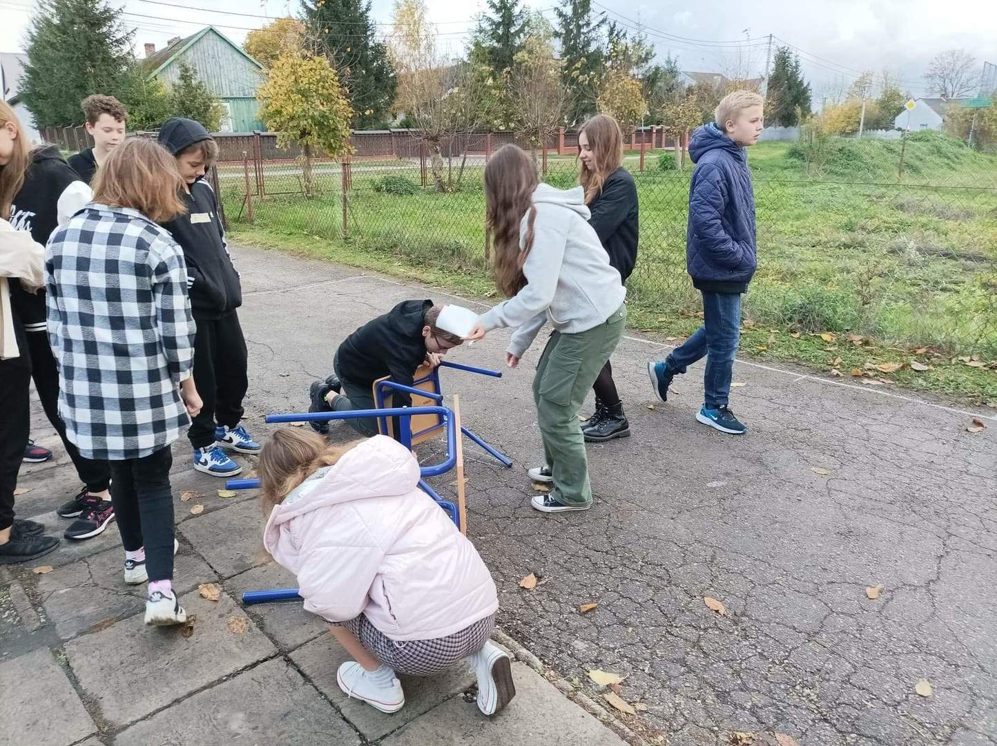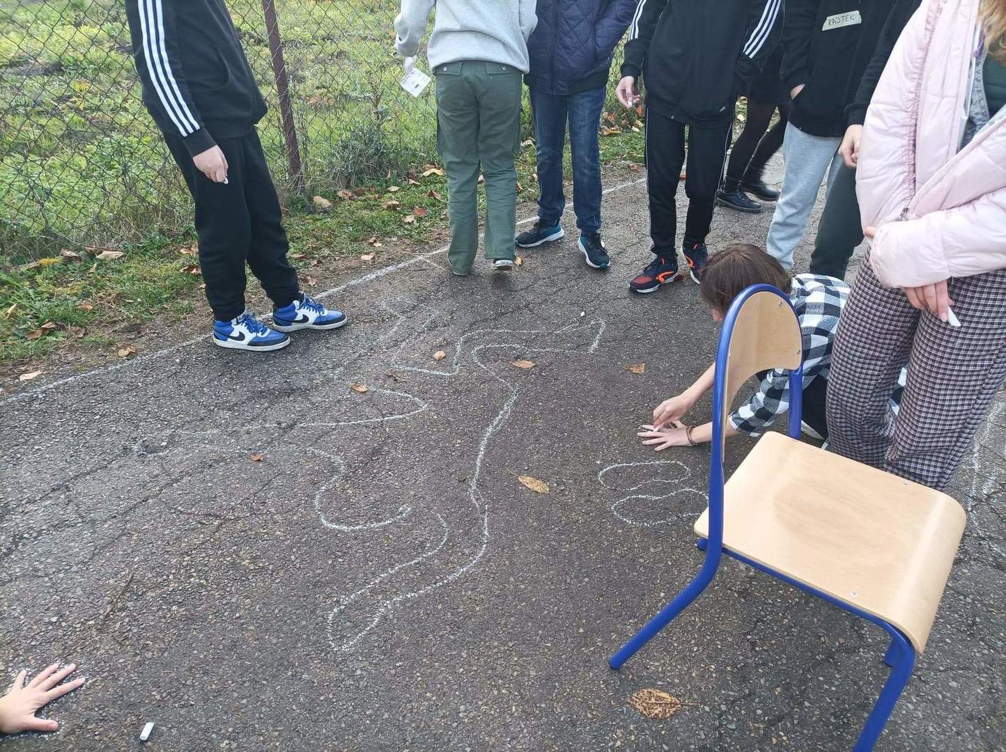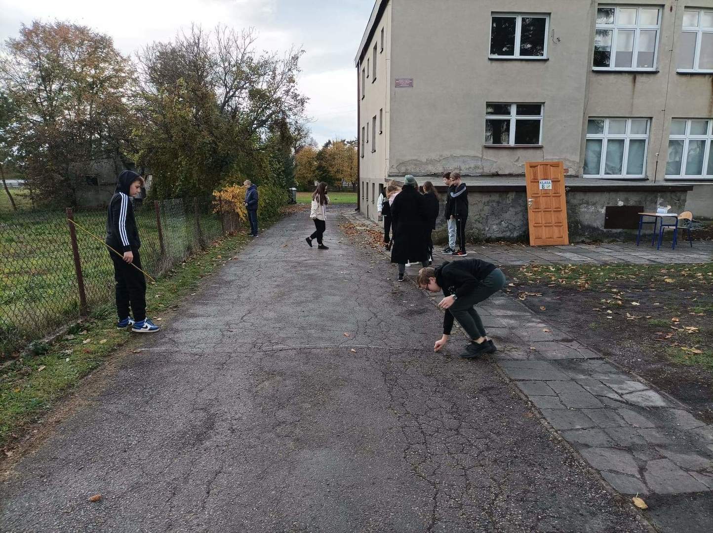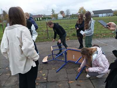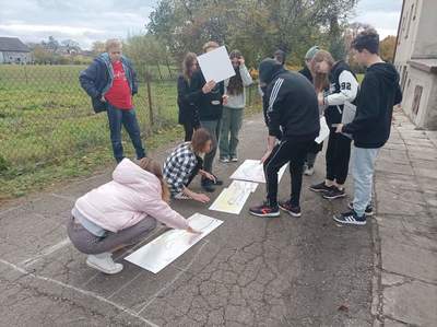Drugi dzień naszych działań w ramach projektu „Formy Podstawowe” przyniósł zaskakujące rezultaty. Warsztaty rozpoczęliśmy od pracy z dziełem artystki Maximiliane Baumgartner, która zaprosiła nas do stworzenia obrazu nowej, wymarzonej klasy. Obraz jednak nie powstawał na kartce papieru, ani na płótnie… Nowa sala lekcyjna, tworzyła się w rzeczywistym czasie, w skali 1:1 i to na świeżym powietrzu!