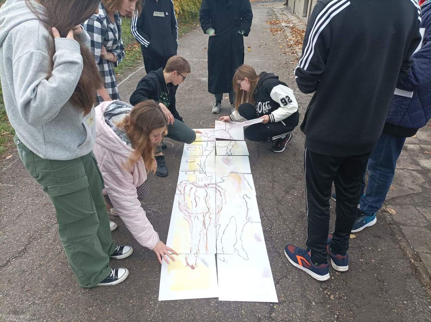 Za pomocą kredy, uczniowie stworzyli zarys nowej klasy, dorysowali ważne elementy, umieścili w niej najważniejsze przedmioty z ich prawdziwej sali, a następnie próbowali ułożyć obraz z fragmentów podarowanych przez artystkę. Do uczniów należała decyzja gdzie i w jaki sposób będzie umieszczony każdy element – czy stworzą z niego spójną całość, czy zupełną abstrakcję. Podczas realizacji tego dzieła uczniowie ćwiczyli umiejętność współpracy oraz dzielenia się przestrzenią – w nowej klasie każdy znalazł swoje miejsce i oznaczył je w indywidualny sposób.