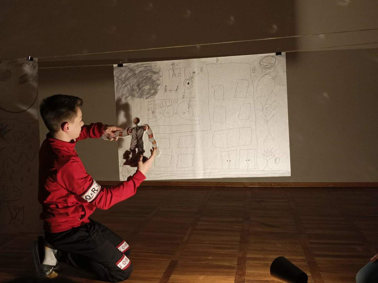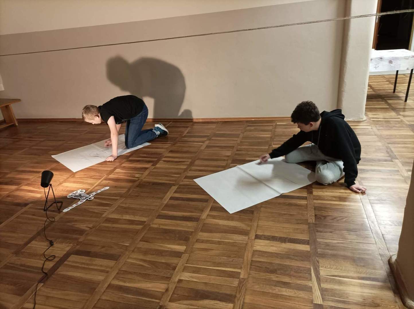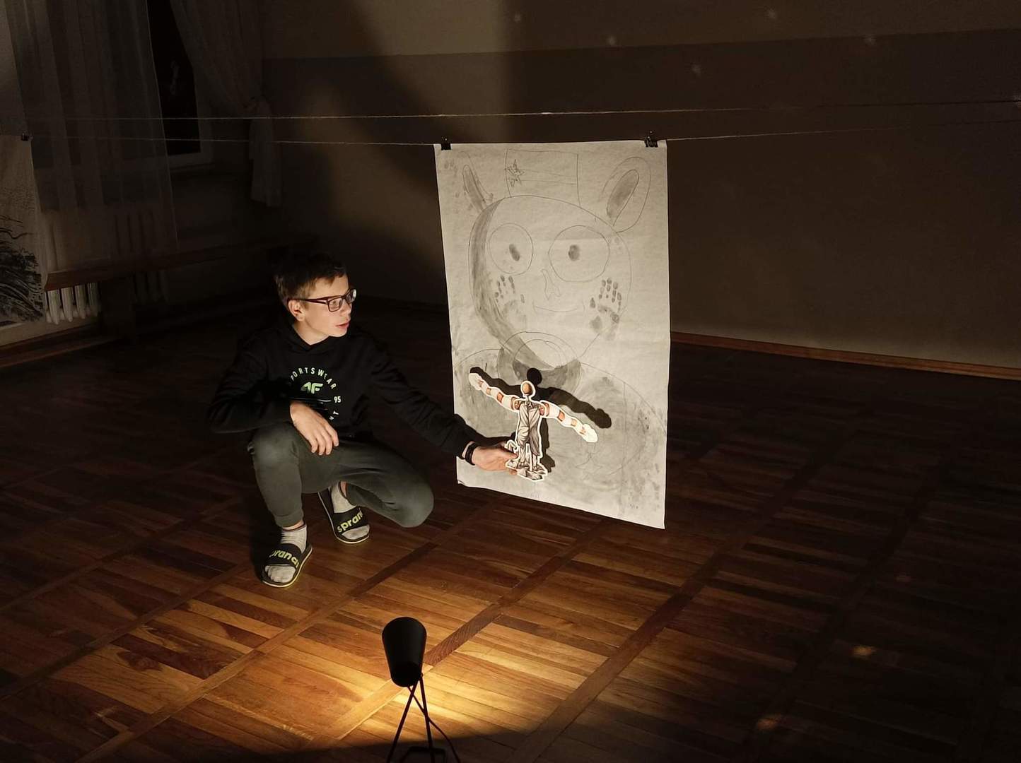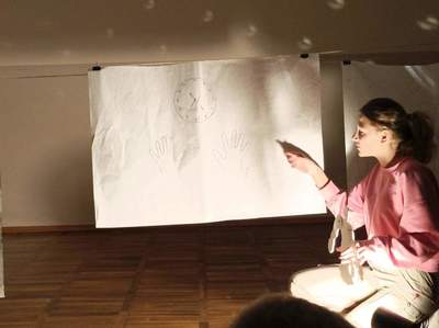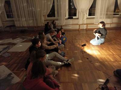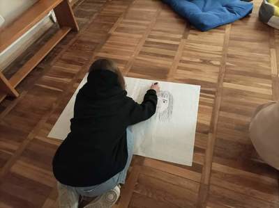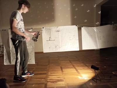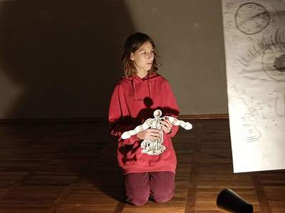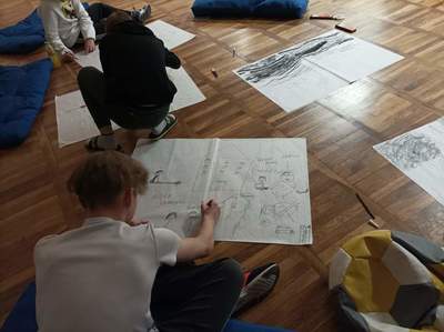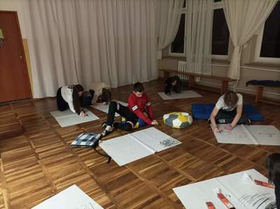 W czwartek o godzinie 18.00 spotkaliśmy się w szkole z Panią Magdaleną Kreis – edukatorką, która towarzyszyła nam od początku warsztatów. Na rozgrzewkę, przed pracą z dziełami artystów, Pani Magdalena zaproponowała nam ciekawe działanie artystyczne. Uczniowie, na dużych arkuszach papieru, rysowali co im w duszy gra! Następnie próbowali połączyć wątki ze swoich dzieł (zupełnie niepodobne do siebie wątki) w jedną spójną historię przy pomocy światła i cienia. Było to bardzo ciekawe doświadczenie, wymagające nie tylko skupienia się na słowach uczestników, ale także ogromnej kreatywności do wymyślenia dalszego ciągu historii na podstawie własnego rysunku. Okazało się to nie lada wyzwaniem, gdyż historia rozpoczynała się w głębinach morskich w towarzystwie dziwolągów… a snuła się dalej przez place zabaw, wycieczki z nauczycielami, a nawet więzienie….aż zawędrowała do Goleniów. Młodzież ma ogromny potencjał twórczy!