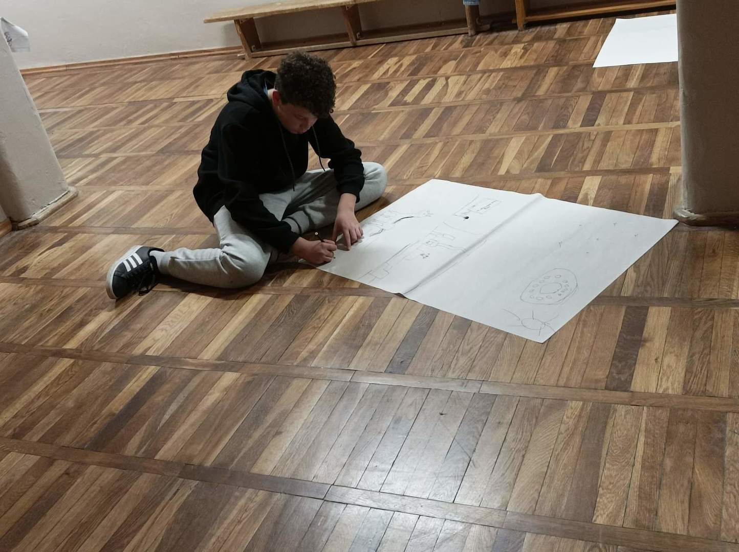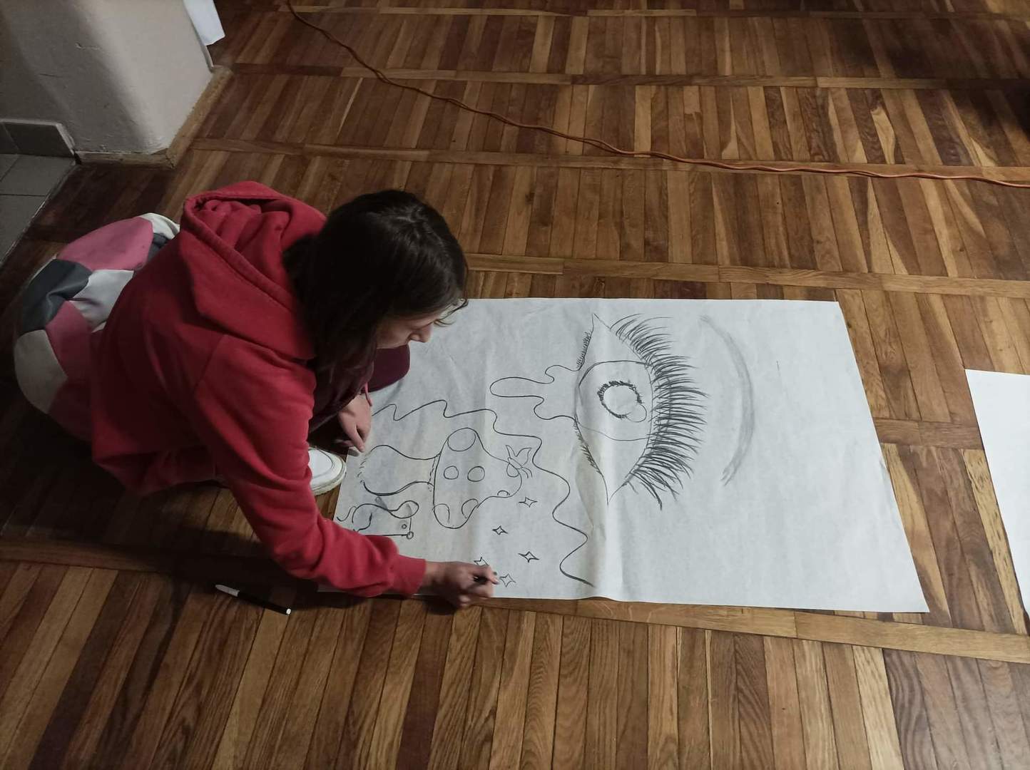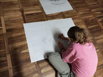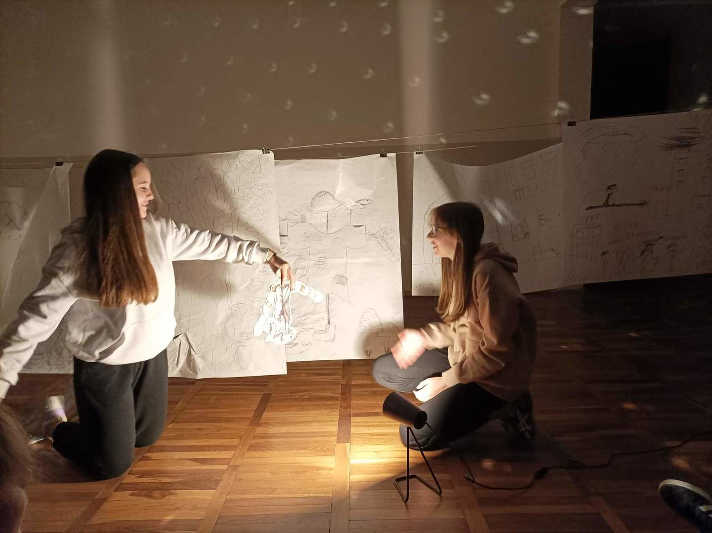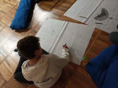 W czwartek o godzinie 18.00 spotkaliśmy się w szkole z Panią Magdaleną Kreis – edukatorką, która towarzyszyła nam od początku warsztatów. Na rozgrzewkę, przed pracą z dziełami artystów, Pani Magdalena zaproponowała nam ciekawe działanie artystyczne. Uczniowie, na dużych arkuszach papieru, rysowali co im w duszy gra! Następnie próbowali połączyć wątki ze swoich dzieł (zupełnie niepodobne do siebie wątki) w jedną spójną historię przy pomocy światła i cienia. Było to bardzo ciekawe doświadczenie, wymagające nie tylko skupienia się na słowach uczestników, ale także ogromnej kreatywności do wymyślenia dalszego ciągu historii na podstawie własnego rysunku. Okazało się to nie lada wyzwaniem, gdyż historia rozpoczynała się w głębinach morskich w towarzystwie dziwolągów… a snuła się dalej przez place zabaw, wycieczki z nauczycielami, a nawet więzienie….aż zawędrowała do Goleniów. Młodzież ma ogromny potencjał twórczy!
