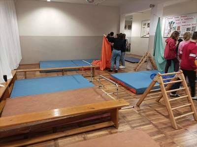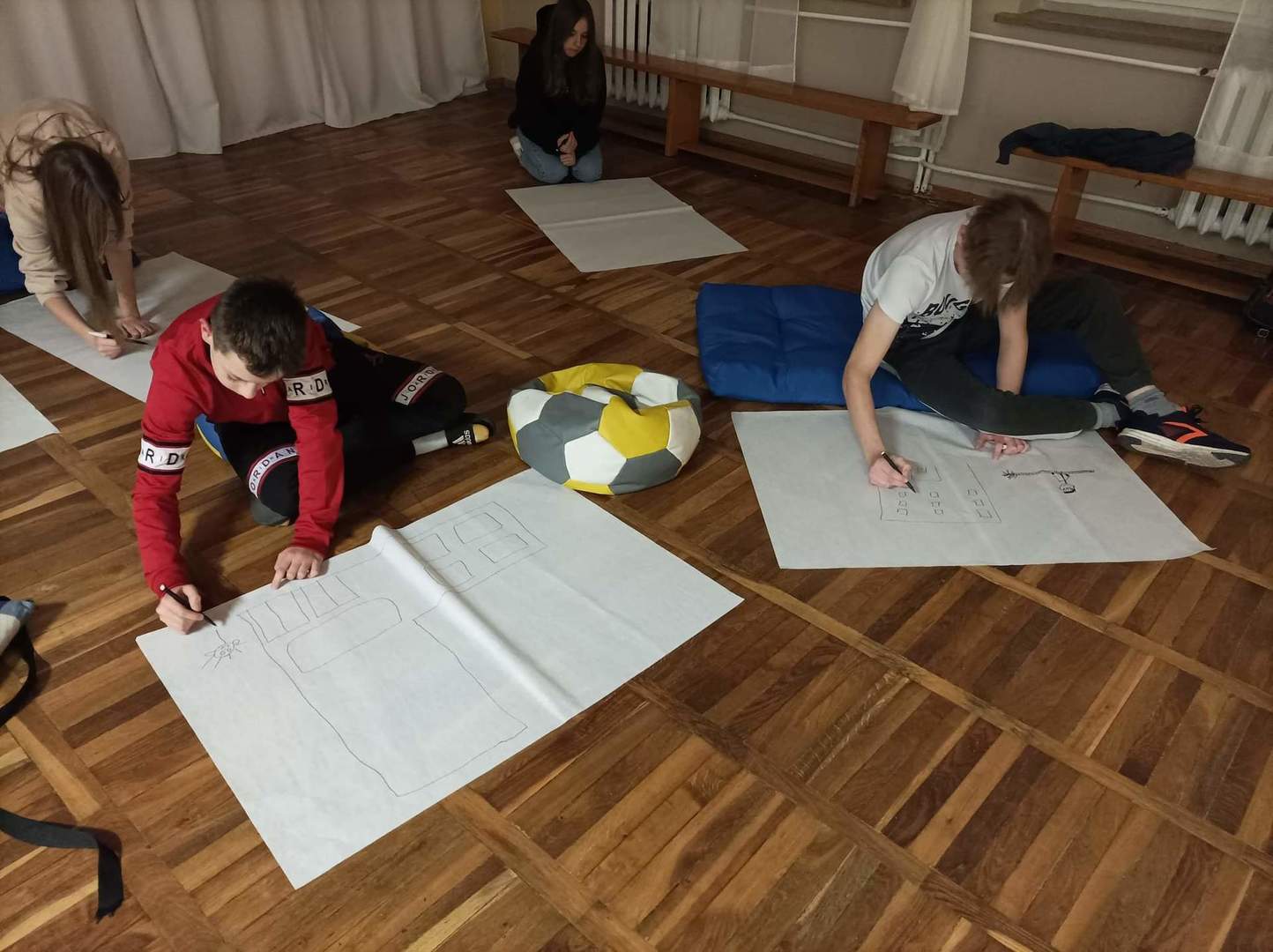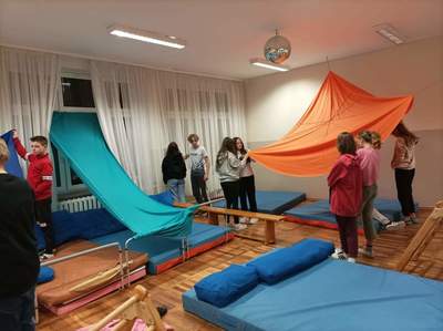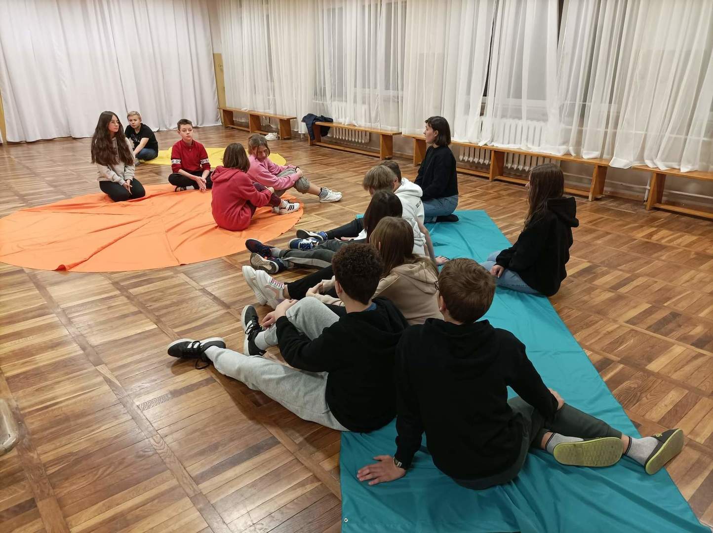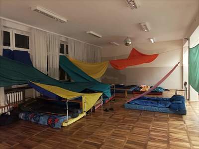Po tej pełnej uśmiechu rozgrzewce, przystąpiliśmy do pracy z dziełem Alicji Bielawskiej. Były to piękne, kolorowe materiały o różnych kształtach. Uczniowie w mgnieniu oka znaleźli dla nich zastosowanie – przygotowali sobie bezpieczną i przyjazną przestrzeń do snu. Utworzyli różnokolorowe baldachimy, które zmieniły hol szkolny w niemal bajkową krainę!
