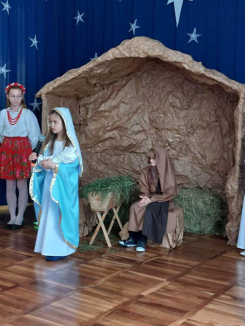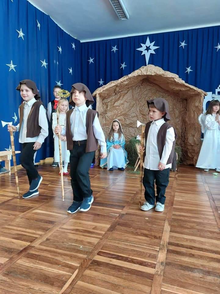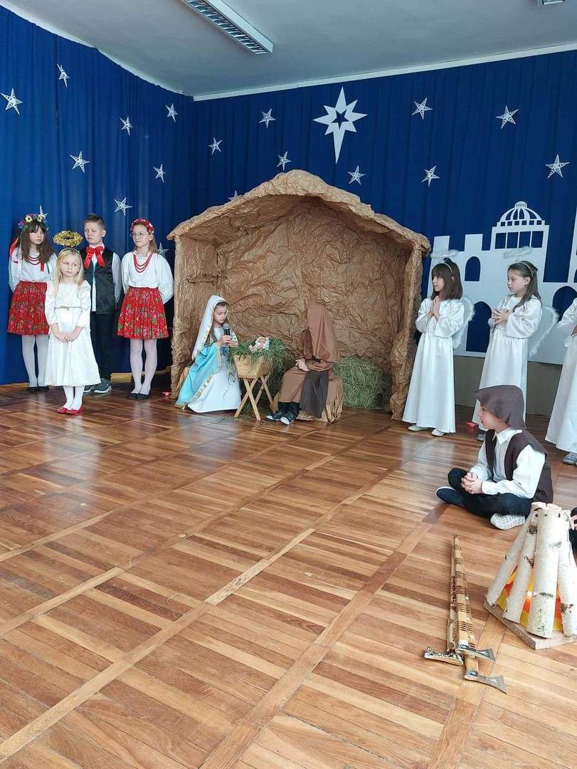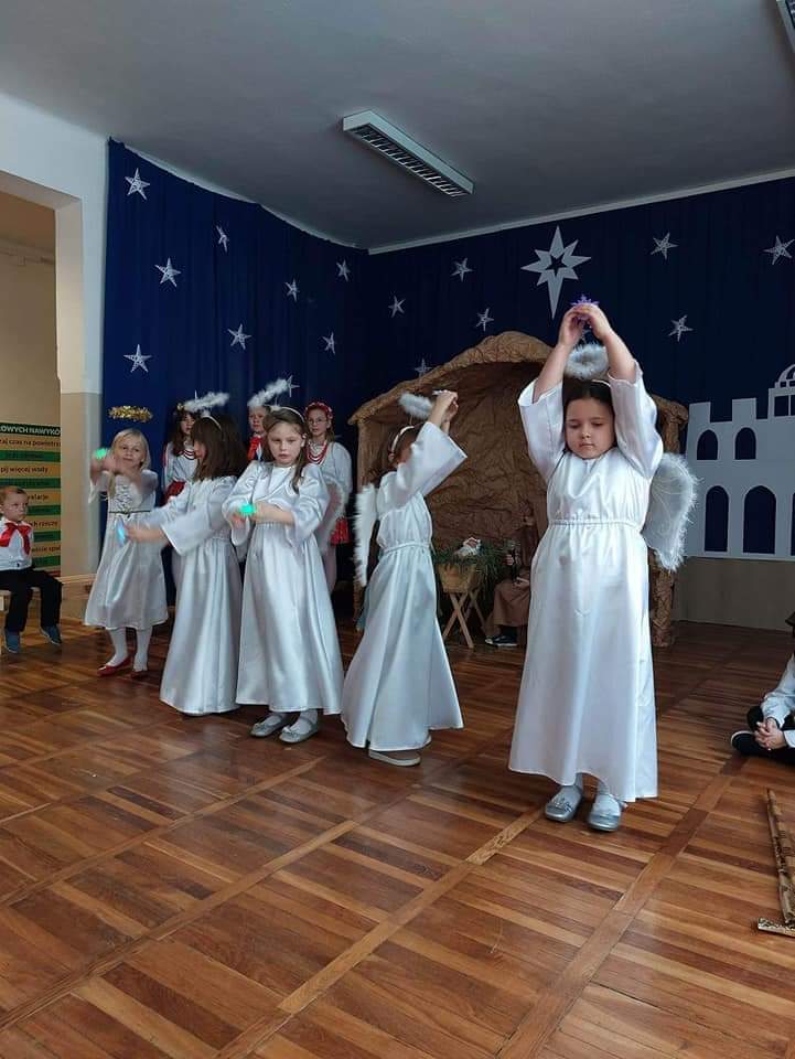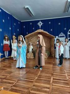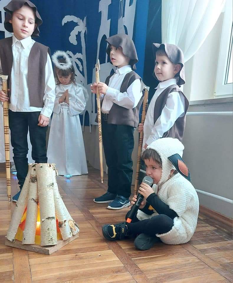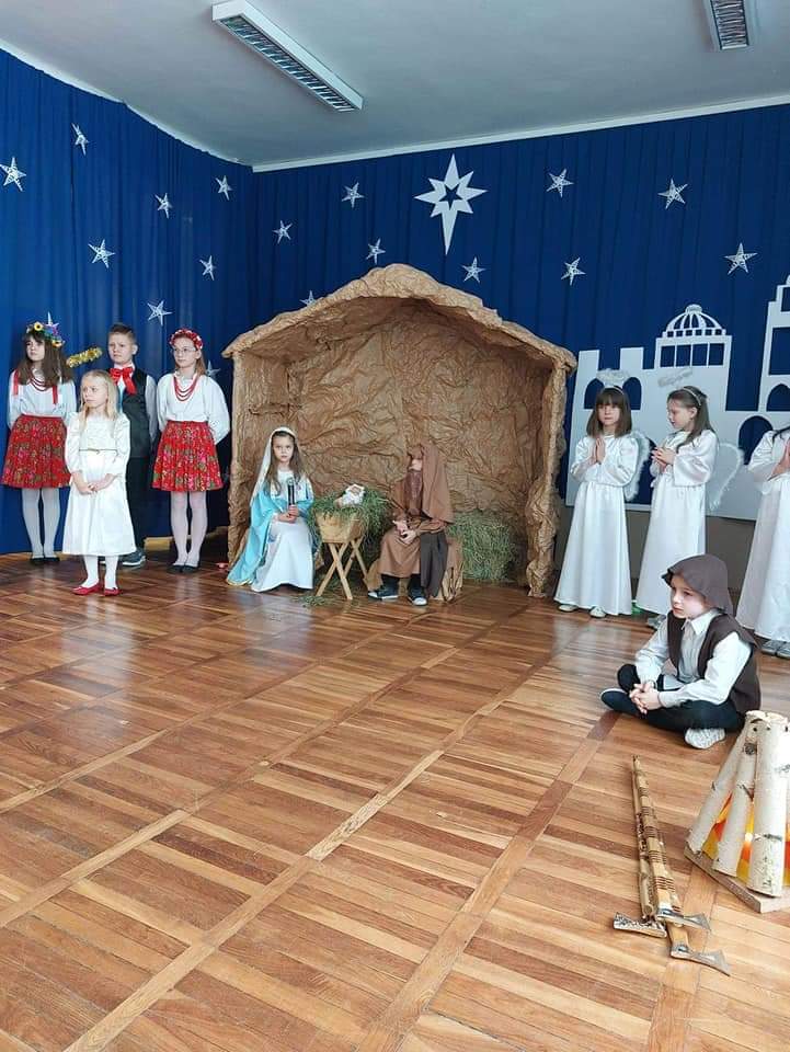 Okres Bożego Narodzenia to wyjątkowy i magiczny czas, pełen radości i serdecznych spotkań. Aby podkreślić niezwykły charakter świąt, tradycyjnie jak co roku w naszym przedszkolu, 21.12.2022 r. dzieci zaprezentowały całej społeczności szkolnej oraz swoim najbliższym, przygotowywane od kilku tygodni Jasełka. Podczas inscenizacji przedszkolaki przedstawiły opowieść o narodzinach Dzieciątka Jezus. Najmłodsi artyści w sposób szczególny odegrali przydzielone role, prezentując swoje umiejętności przed szerszą publicznością. Najświętszej Rodzinie pokłon oddali aniołowie, gwiazdki, pastuszkowie, owieczki, królowie i dzieci. Były wierszyki, śpiewy i układy taneczno – ruchowe. Urokliwa scenografia nawiązująca do Betlejem oraz kolorowe kostiumy były idealnym dopełnieniem widowiska. Całej uroczystości towarzyszyła przepiękna gama kolęd i pastorałek. Po części artystycznej wszyscy zgromadzeni wzięli udział we wspólnej Wigilii.