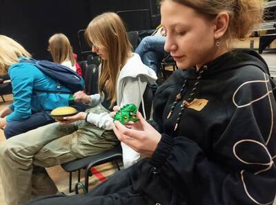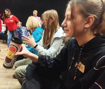 Podczas tego spotkania znów mieliśmy okazję doświadczać czegoś nieoczywistego – mogliśmy nagrać dźwięki pod wodą za pomocą specjalnego hydrofonu. Z hydrofonem działaliśmy pod okiem Pana Igora Nikiforowa z zespołu „Jerz Igor”, który nagrywał dźwięki wytworzone przez nas za pomocą różnych instrumentów oraz przedmiotów codziennego użytku. W międzyczasie pracowaliśmy też nad synchronizacją ruchów i dźwięków powstających za pomocą głosu, własnego ciała i różnych instrumentów, które kojarzyły się z wodą. Te warsztaty z kolei prowadziła dla nas Pani Joanna Bronisławska – artystka o pseudonimie ASI MINA. Przekonaliśmy się, że liczba sposobów w jakie można wydobyć dźwięk, nie posiadając żadnego instrumentu, jest nieograniczona!