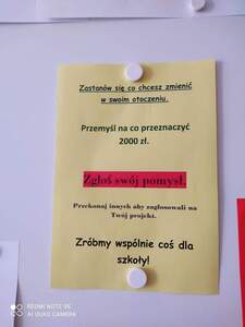 Uczniowie klas IV-VIII mieli możliwość złożenia wniosków na zakup tego, co mogłoby posłużyć społeczności naszej szkoły. Do wydania kwota 2000zł.