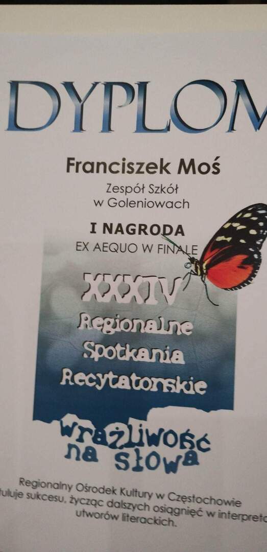 Z radością informujemy, że nasz uczeń, Franciszek Moś, zdobył I miejsce w finale "XXXIV Regionalnych Spotkań Recytatorskich. Wrażliwość na słowa".