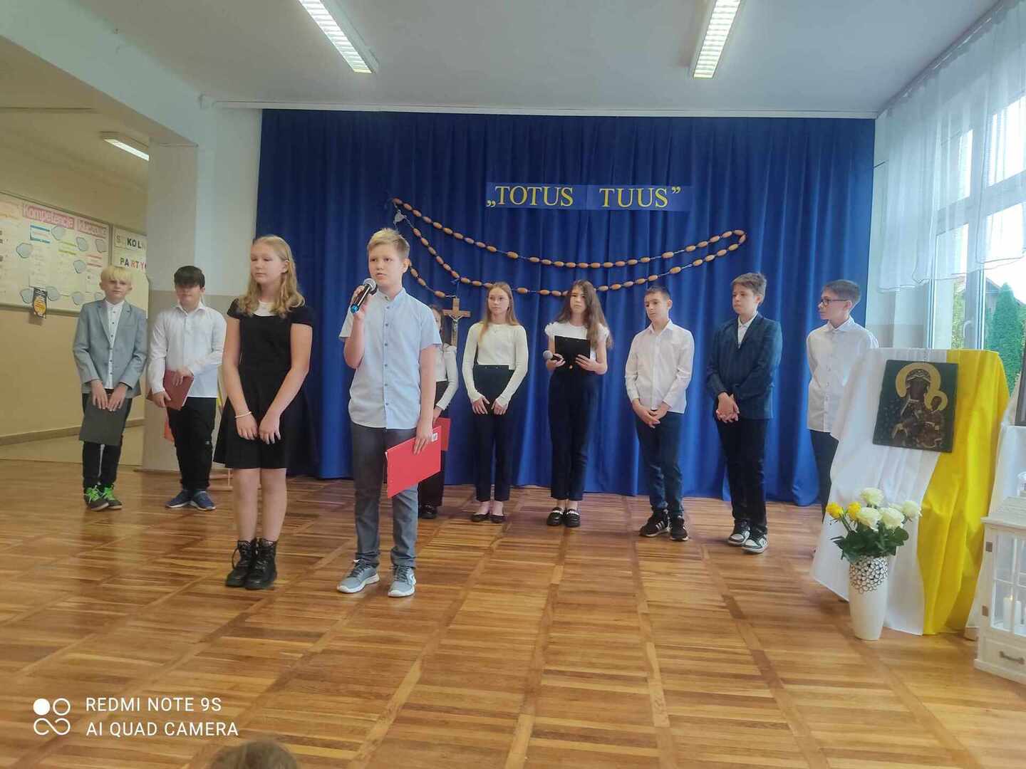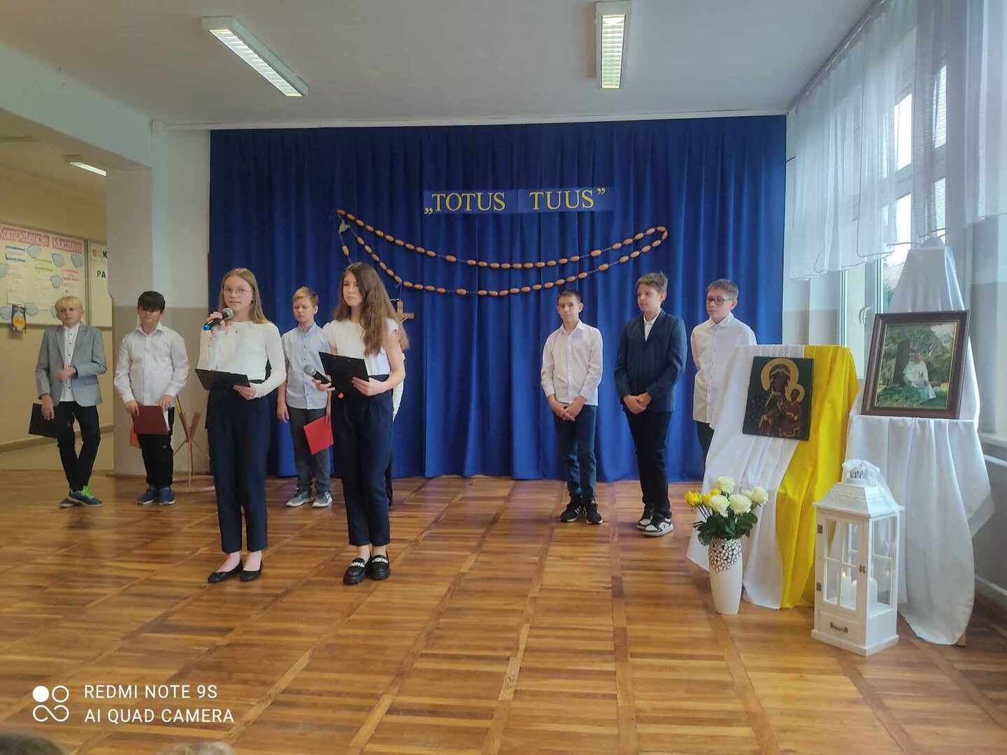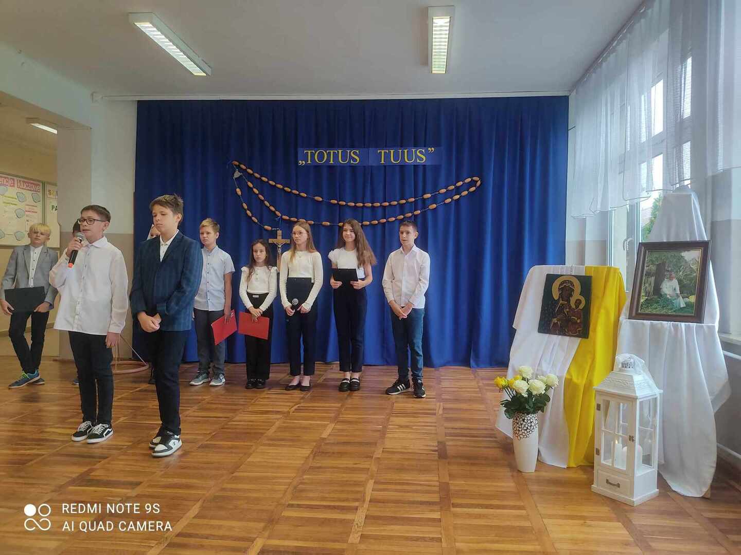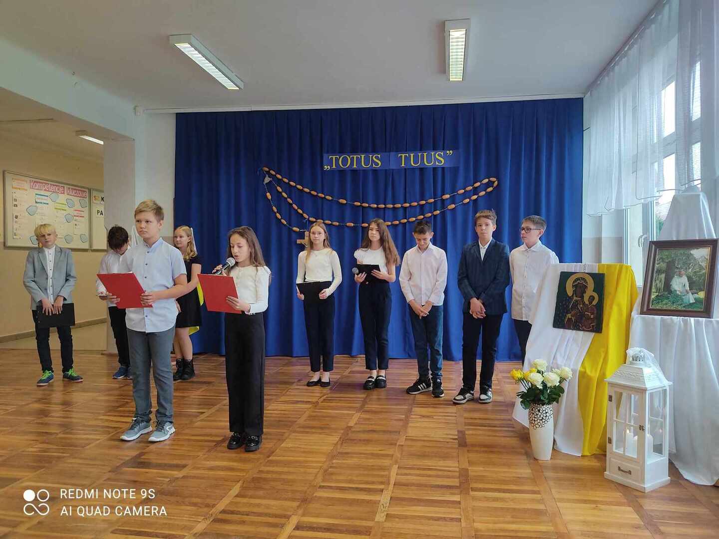 19 października 2023 roku w naszej szkole odbyła się akademia poświęcona wielkiemu Polakowi. Uczniowie klasy szóstej (pod kierunkiem p. Urszuli Fiok-Grycner) w oryginalny sposób przybliżyli postać Jana Pawła II, tworząc "żywy różaniec", jedną z ulubionych modlitw papieża. Każda tajemnica zawierała rozważania nawiązujące do wydarzeń z Jego życia. Uczniowie przypomnieli wszystkim skąd pochodzi biskupie wezwanie "Totus Tuus" i zaprezentowali ważne momenty pontyfikatu.