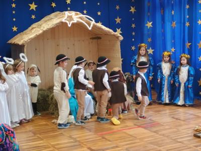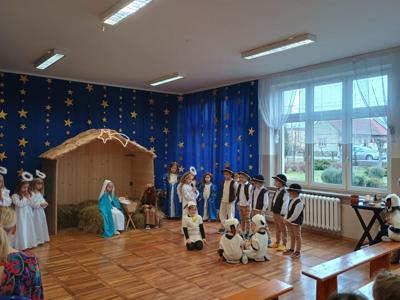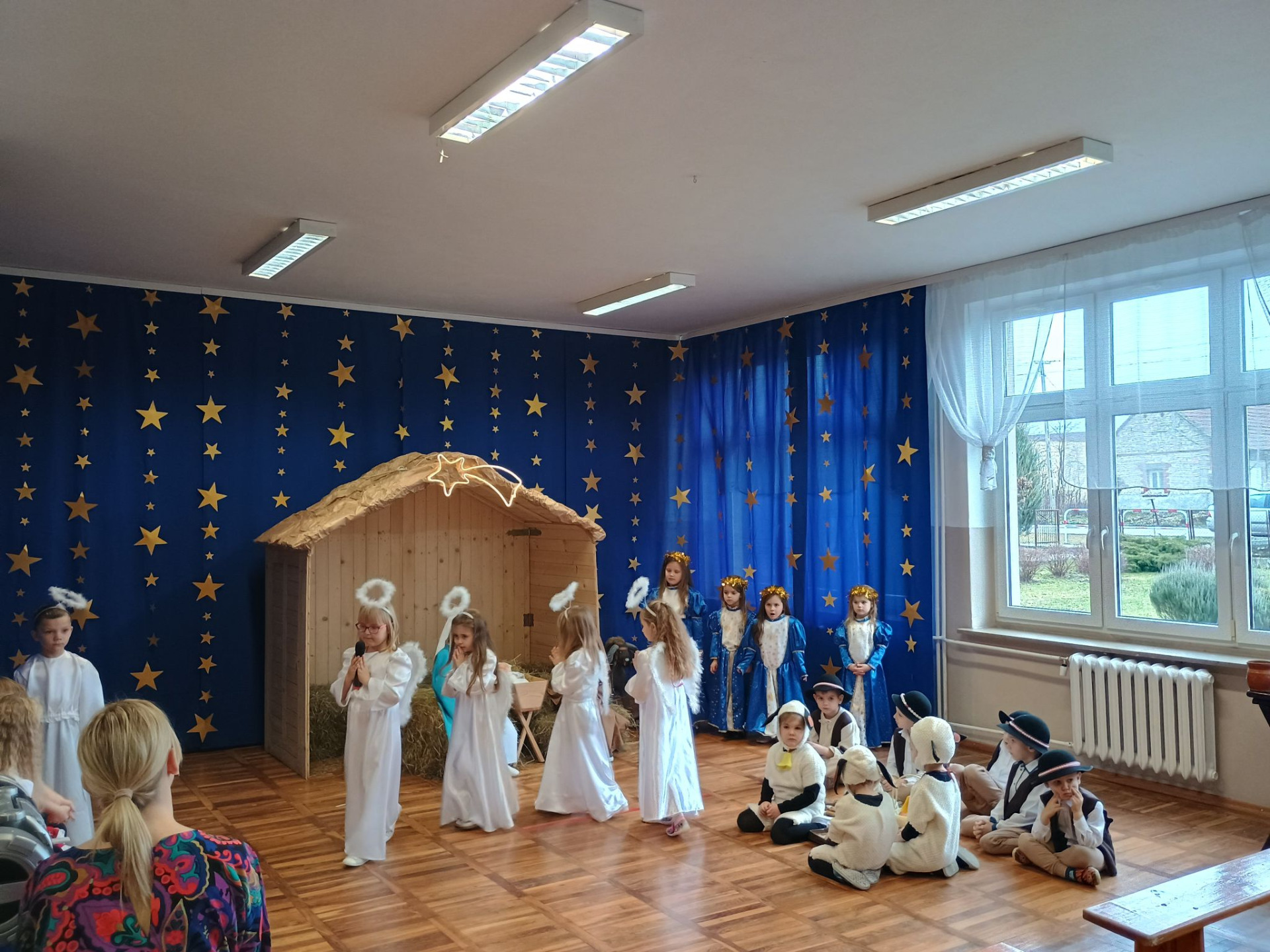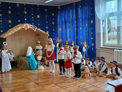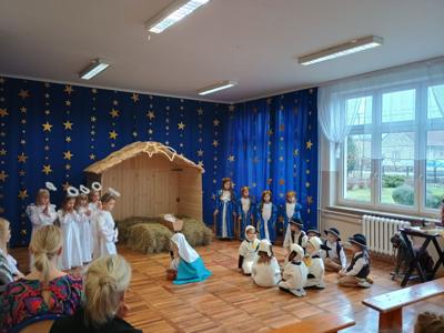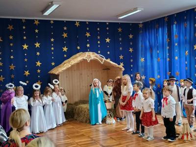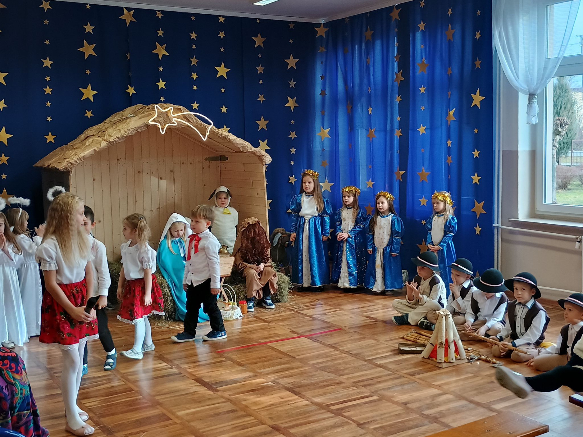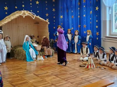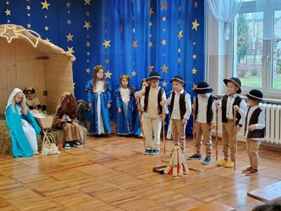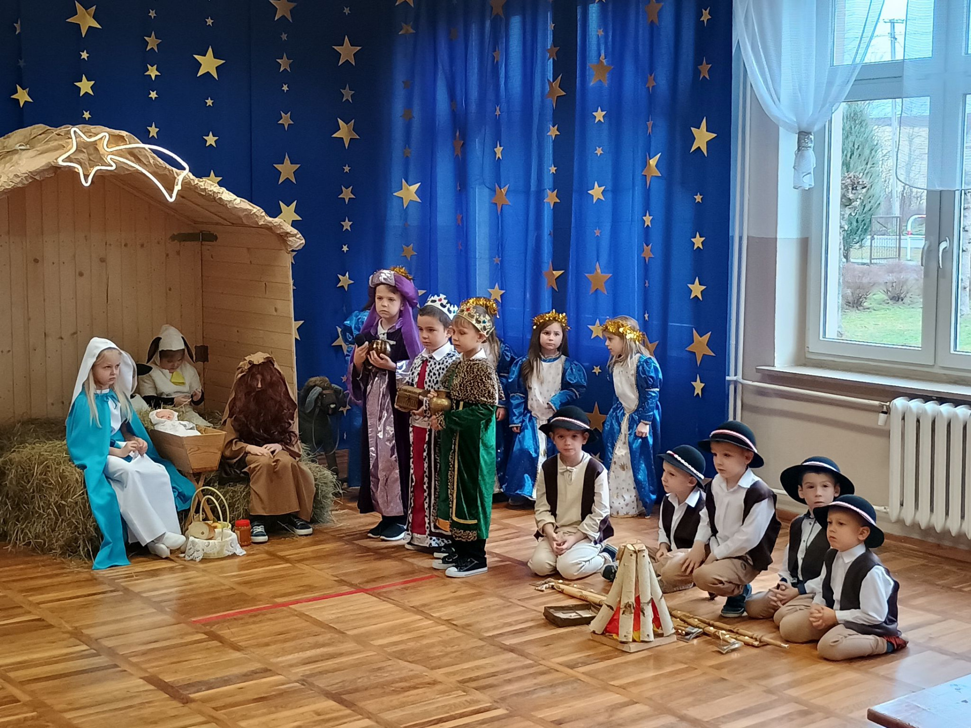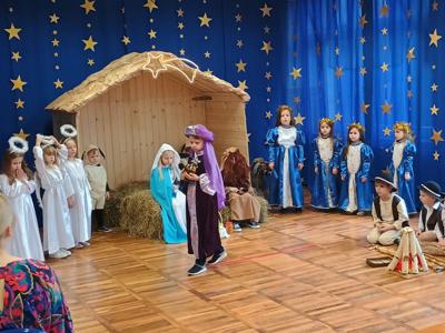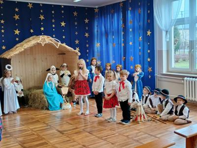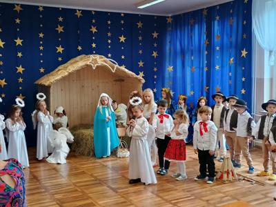 Jak co roku, nasze przedszkolaki (pod kierunkiem p. Eweliny Kapłon i p. Beaty Żak) wcieliły się w role postaci i zwierząt nieodzownie związanych z narodzeniem Dzieciątka Jezus.