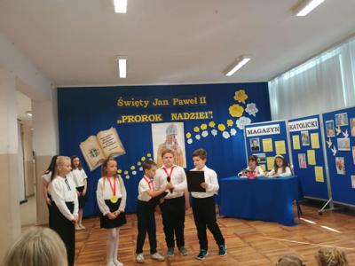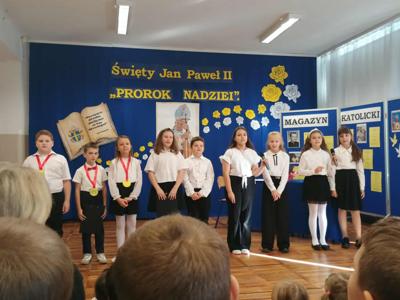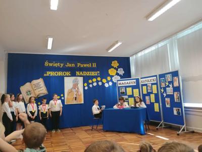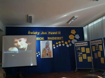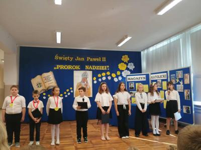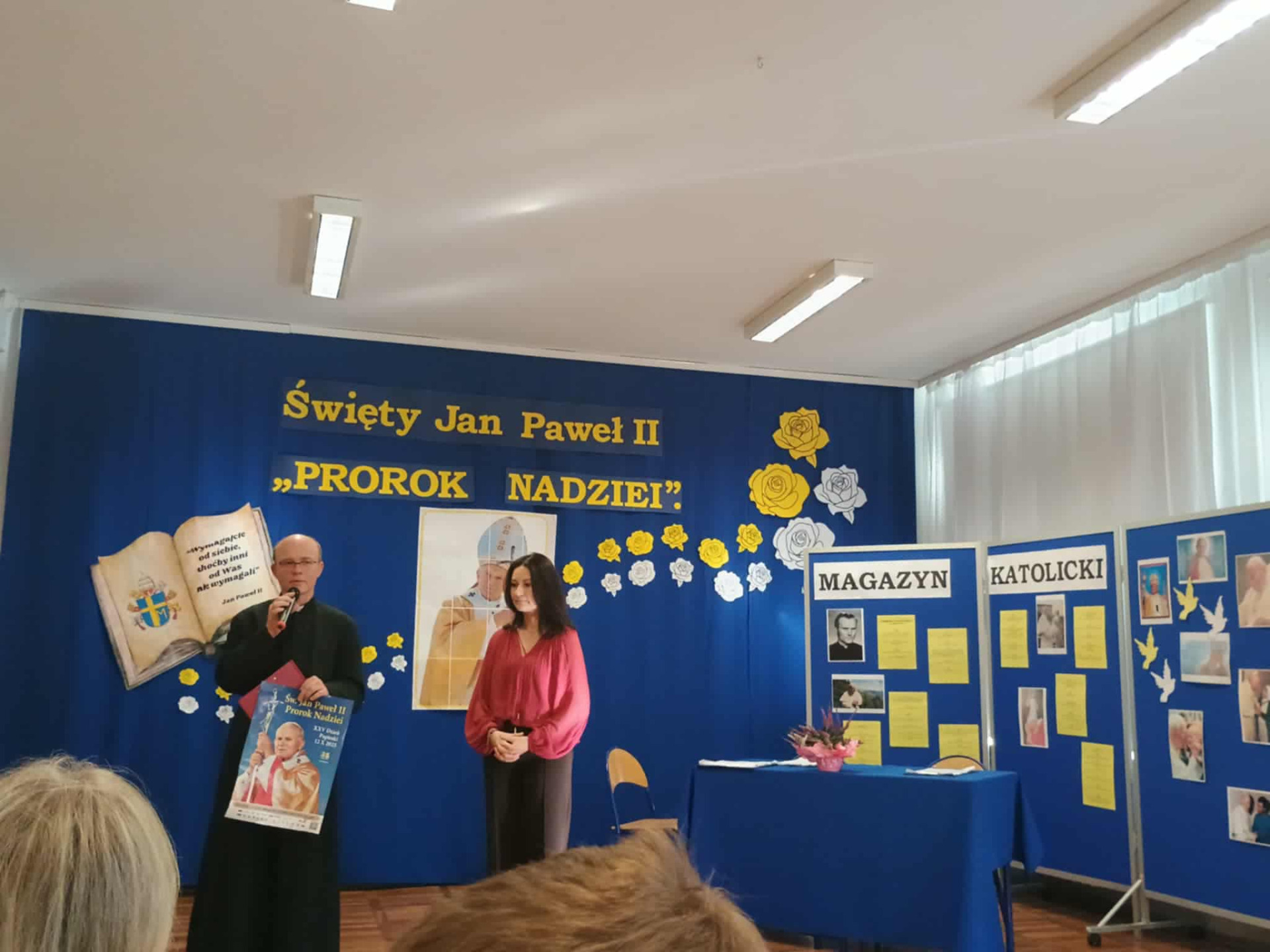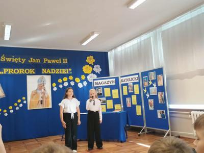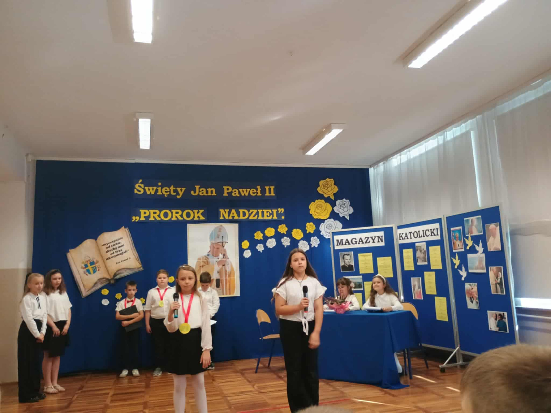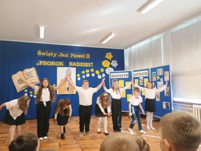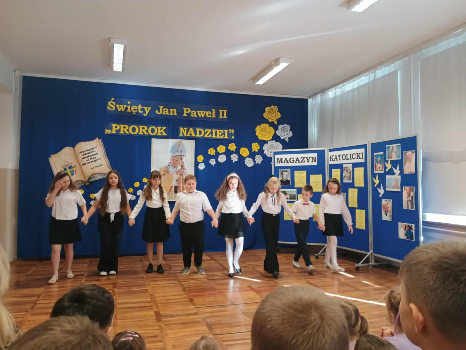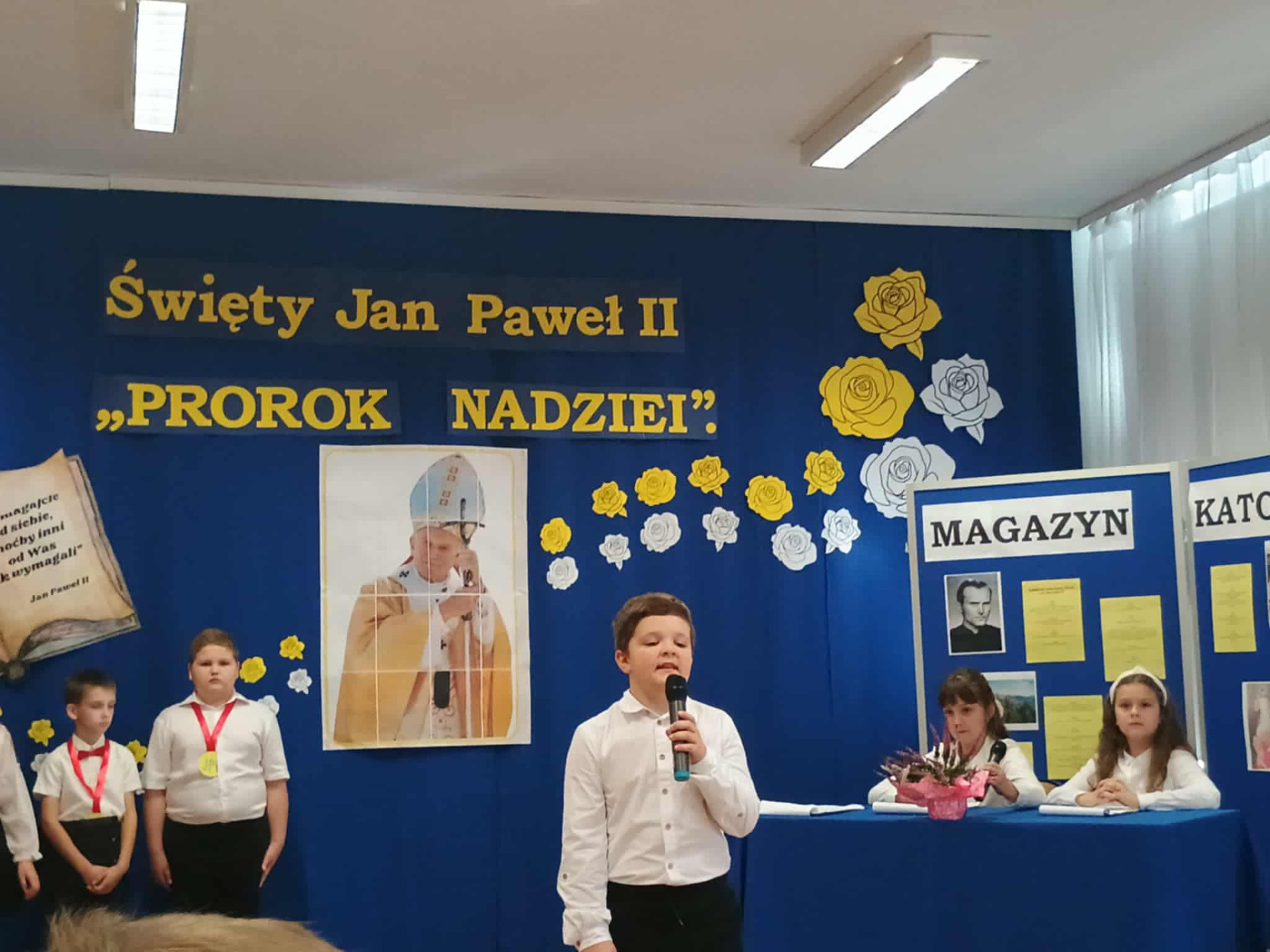 23 października odbyła się uroczysta akademia poświęcona pamięci św. Jana Pawła II – wielkiego Polaka, Papieża i duchowego przewodnika milionów ludzi na całym świecie. Tegoroczne obchody przebiegały pod hasłem Święty Jan Paweł II „Prorok nadziei”, które przypomina o niezwykłej sile wiary, miłości i nadziei, jaką Ojciec Święty niósł każdemu człowiekowi. W przygotowanie akademii aktywnie włączyli się uczniowie klasy trzeciej, którzy pod opieką wychowawcy oraz ks. Andrzeja zaprezentowali program artystyczny. Uczniowie przedstawili krótkie scenki z życia Jana Pawła II oraz wykonali pieśni, które towarzyszyły mu podczas pielgrzymek i spotkań z wiernymi. Ich występ był pełen emocji, wiary i dziecięcej radości, którą Papież Polak zawsze tak bardzo cenił. Akademia to nie tylko piękna lekcja historii, ale przede wszystkim okazja do refleksji nad przesłaniem Jana Pawła II, który całym swoim życiem świadczył o nadziei, miłości i pokoju. – Magdalena Pakuła