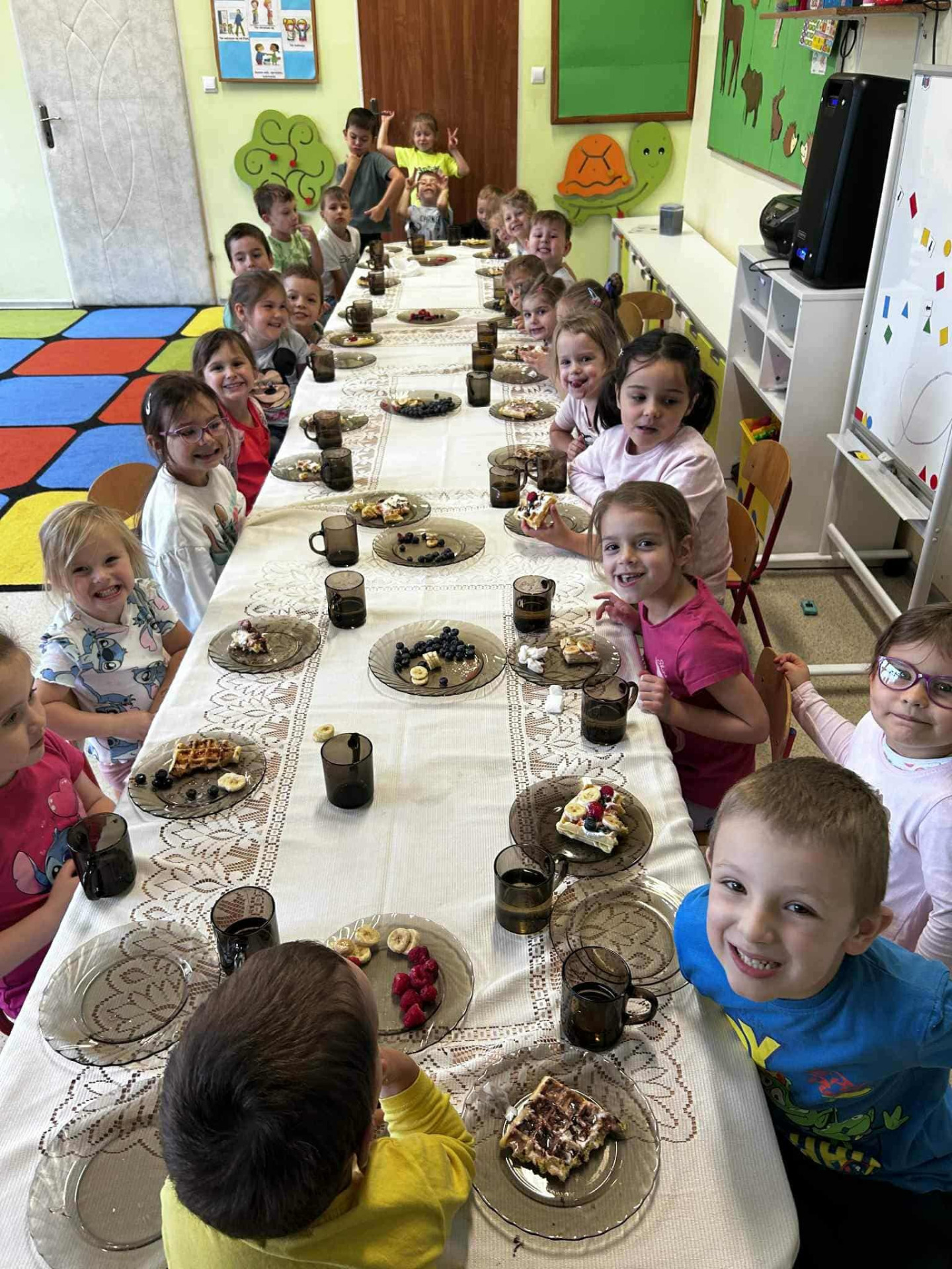 W naszym przedszkolu zawsze chętnie świętujemy wyjątkowe dni – takie, które wywołują uśmiech i uczą życzliwości wobec innych. Z okazji Dnia Chłopaka dziewczynki upiekły dla swoich kolegów chrupiące, pachnące gofry. Nie zabrakło również dodatków — na stole pojawiły się owoce, bita śmietana i kolorowe posypki.