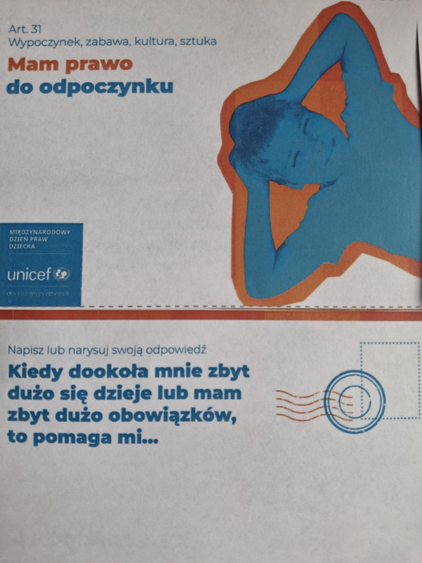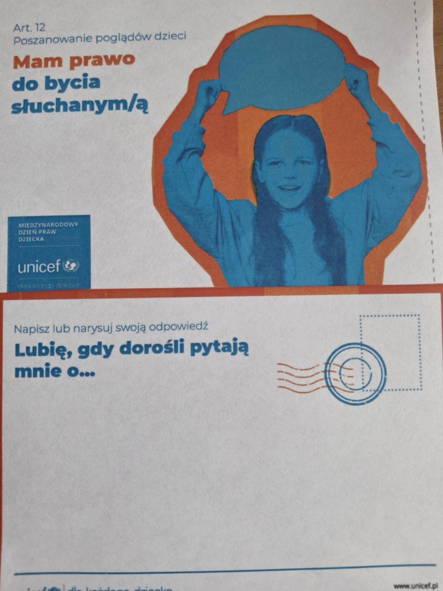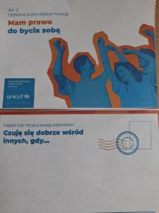 20 listopada obchodziliśmy Międzynarodowy Dzień Praw Dziecka pod hasłem ,,Mój dzień. Moje prawa". W ramach działań szkolnych uczniowie uczestniczyli w pogadankach z pedagogiem szkolnym. W tym roku przeprowadzona została akcja UNICEF Polska ,,Prawa dziecka na pocztówkach". Uczniowie odnieśli się do wybranych praw z Konwencji o Prawach Dziecka ONZ, pisząc swoje komentarze. - Maria Kręcioch