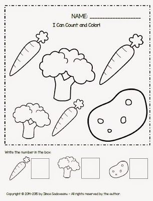 Proszę wydrukować kartę pracy. Dzieci mają policzyć i wpisać liczbę warzyw, a następnie pokolorować obrazek. Proszę, aby dzieci ćwiczyły nazwy warzyw, które kolorują (carrot, broccoli, potato).